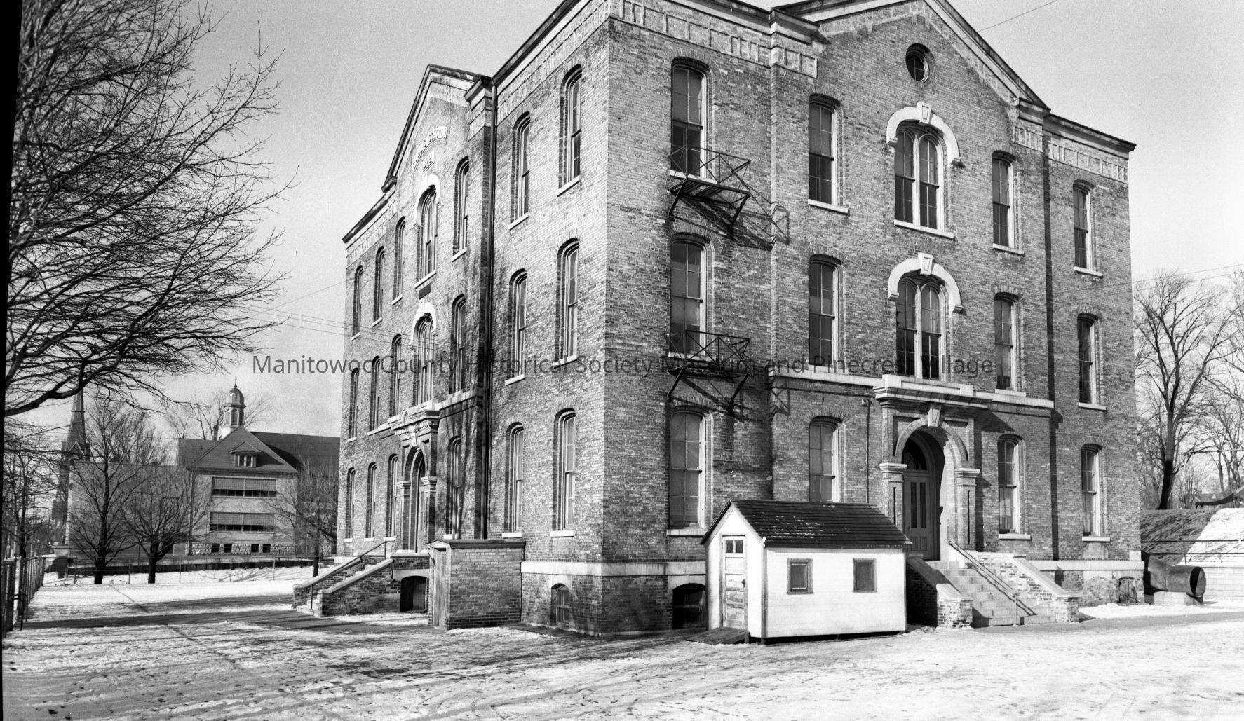 School - Madison, 610 State Street Manitowoc; looking at east and south sides. At left is Sacred Heart church and school, 702 State Street. Photograph taken on January 23rd, 1956.Made/Created