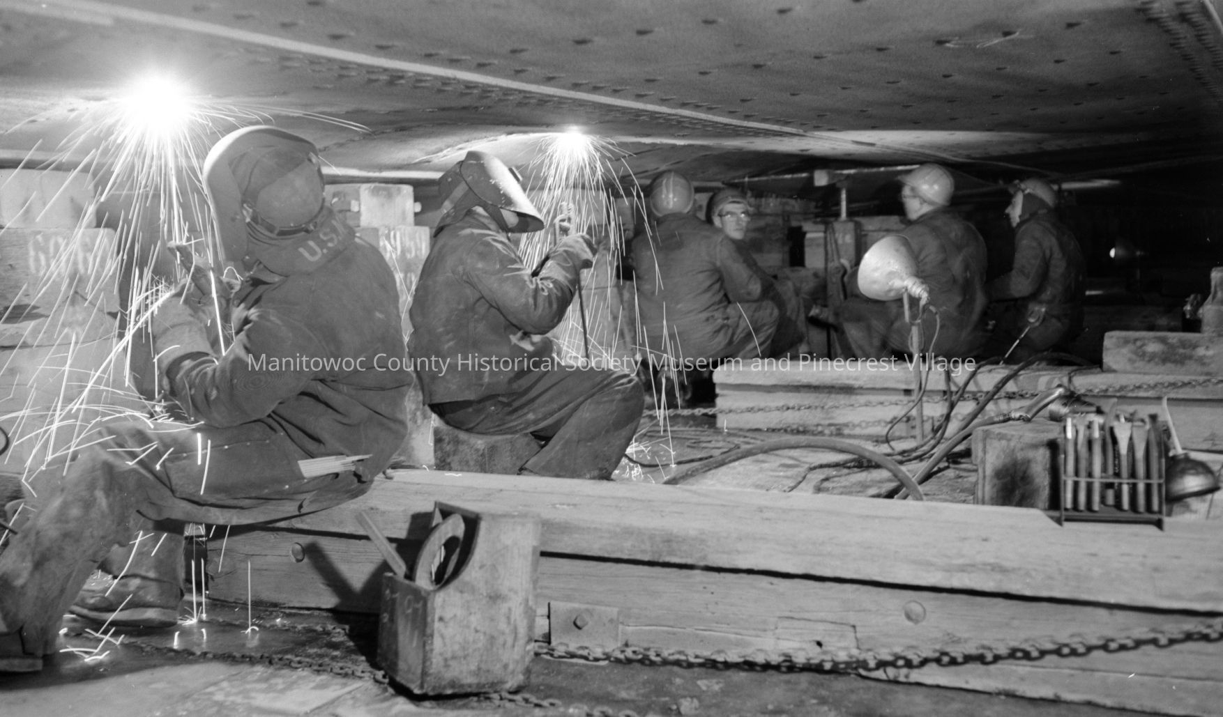 Manitowoc Shipbuilding Company; welders repairing damaged hull plates on carferry Pere Marquette #22 in dry dock. Circa 1960.