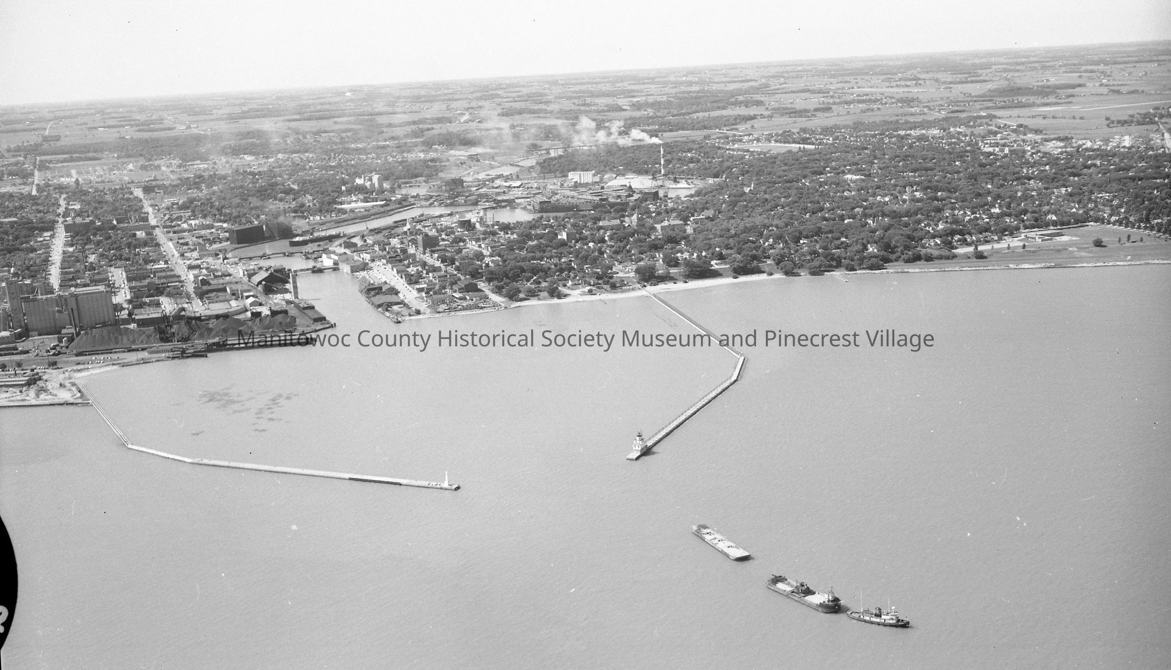 Aerial view of the Manitowoc breakwaters and outer harbor looking west. A tug with converted dredge and dump scow are just leaving harbor. Photograph taken on September 4th, 1958.Made/Created