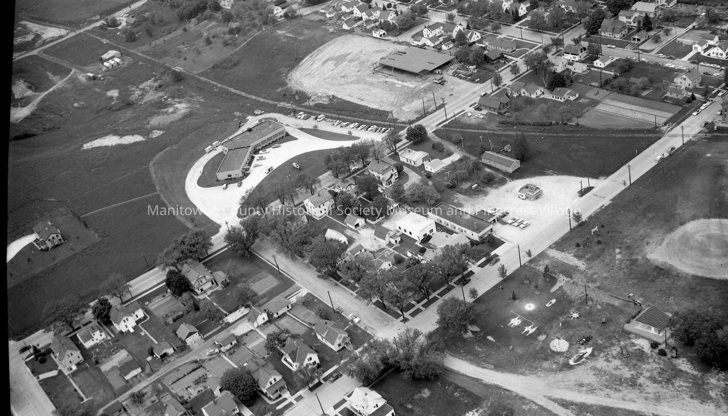 Aerial view of Manitowoc southside. At center is Stangel Super Value, 1920 South 10th Street and Sorge Dairy, 2000 South 10th Street. At center right in middle of parking lot is Late's Bar-B-Que, 1924 South 9th and across the street is a ball diamond at Red Arrow Park. Upper left corner is St. Andrew Catholic church and school, South 14th & Grand Ave. Photograph taken on June 5th, 1957.Made/Created