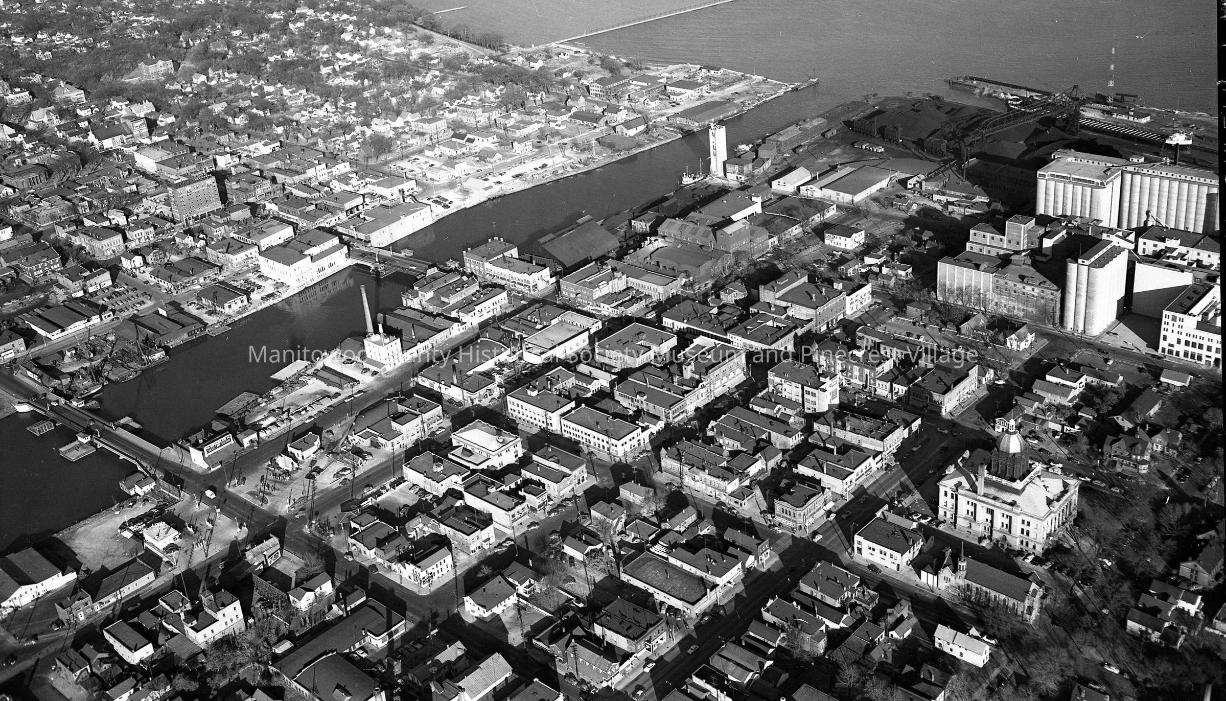 Aerial view of Manitowoc southside; lower right is County Courthouse. Upper right is a C. Reiss boat being unloaded at their lakefront docks. Photograph taken in November 1953.Made/Created