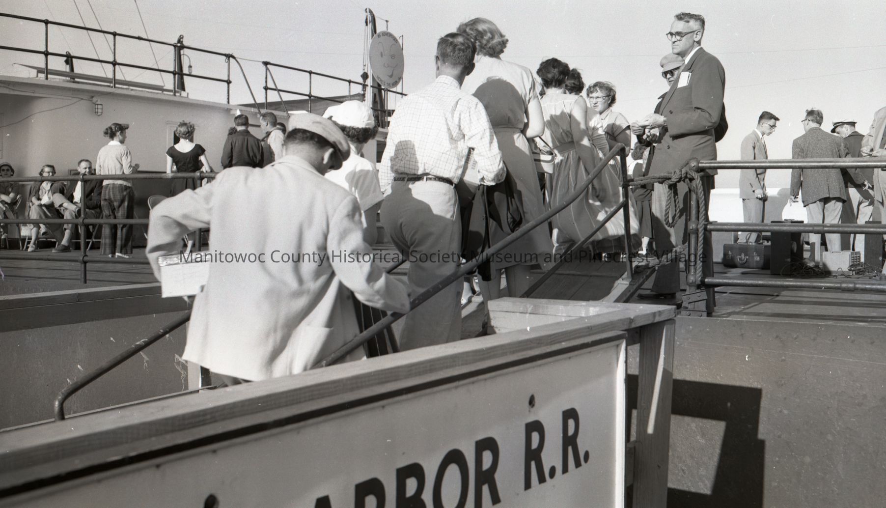 Aluminum Goods Mfg. employees being checked in for company cruise on the car ferry Wabash. Photograph taken July 21st, 1954.