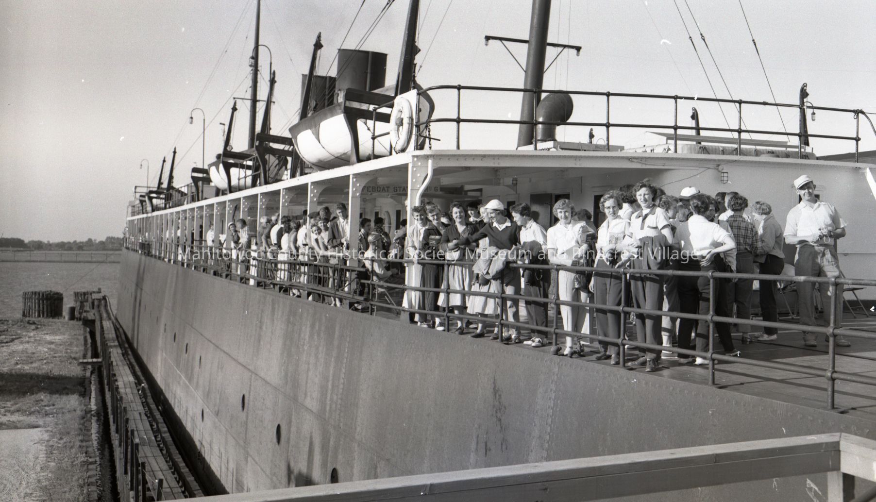 Aluminum Goods Mfg. employees on board the car ferry, Wabash, for company cruise. Photograph taken July 21st, 1954.