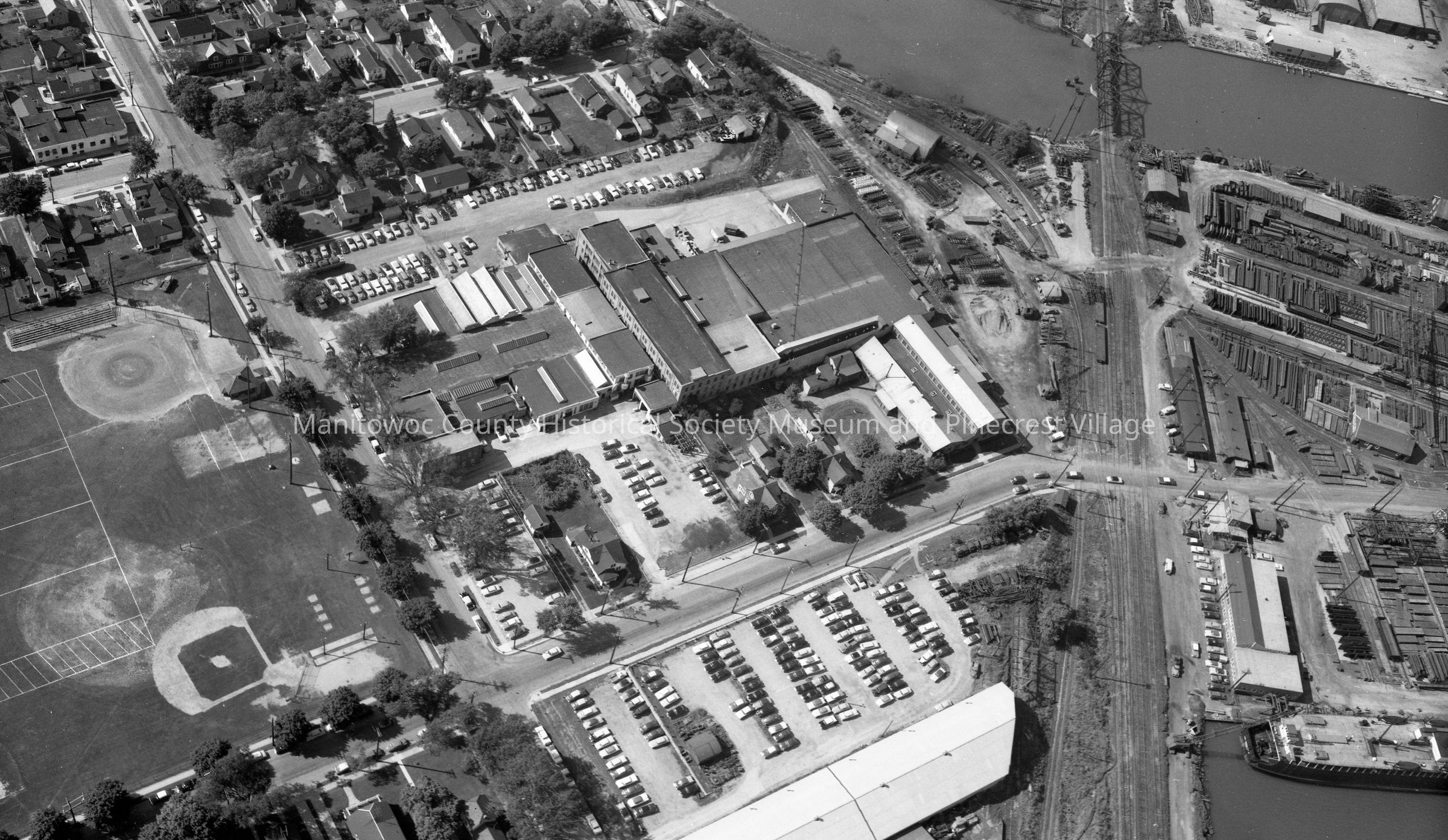 Aerial view of Aluminum Specialty, 1616 Wollmer Street Manitowoc. Right is South 16th Street entrance to Manitowoc Shipbuilding and left is West Field ball diamond. Photograph taken on September 17th, 1957.Made/Created