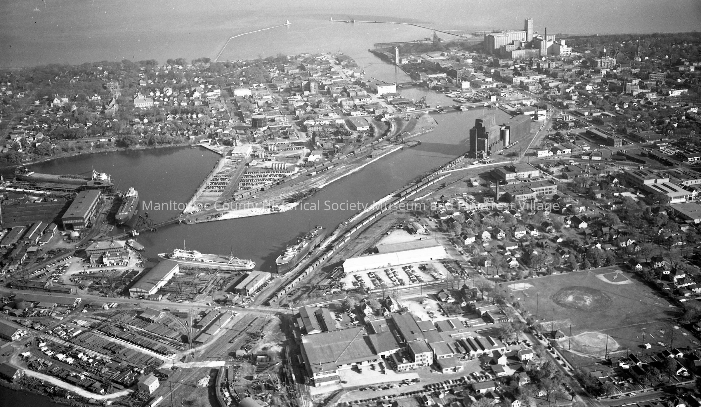 Aerial: Aluminum Specialty, 1616 Wollmer Street Manitowoc. West Field ball diamond. In the river are "Ann Arbor #7", "Milwaukee Clipper", "Chief Wawatam", a self-unloading boat and the "Detroit Edison" being built at Manitowoc Shipbuilding.