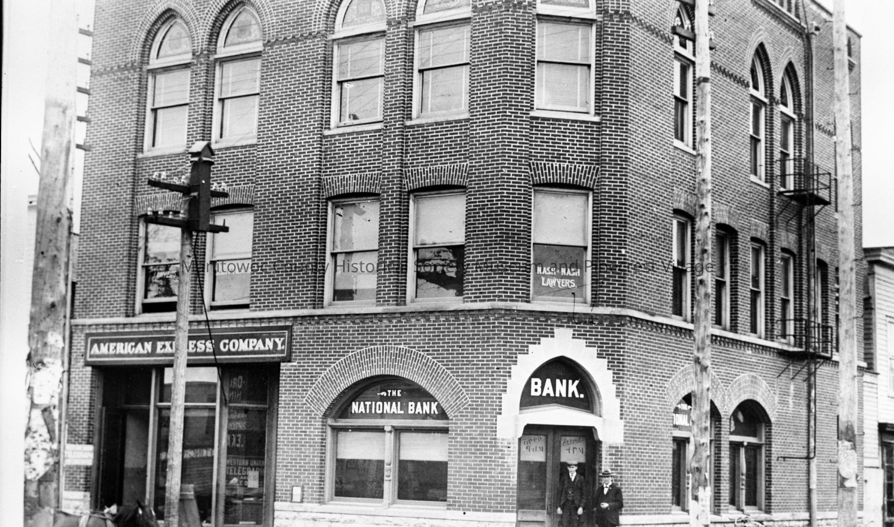 American Express, 116 North 8th and National Bank, 118 North 8th Street Manitowoc. At right is the Herman Schmiedicke Harness Shop, 807 York Street. Photograph taken in 1894.Made/Created