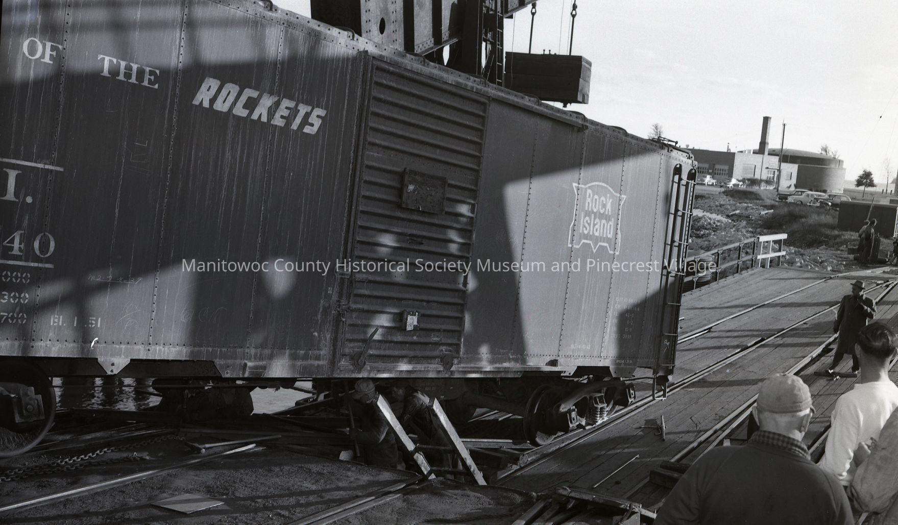 Ann Arbor RR carferry slip damaged with Rock Island RR box car half off carferry. Photograph taken on October 31st, 1954.Made/Created
