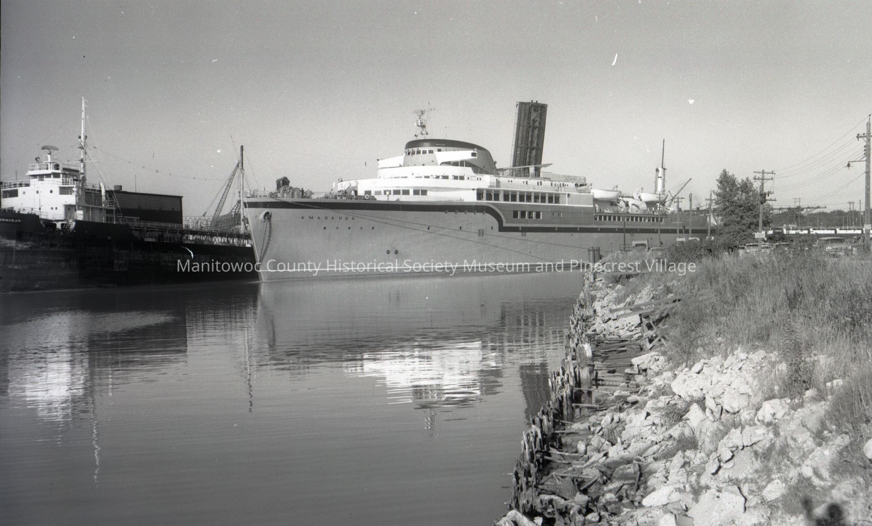 Aquarama, the last of the Great Lakes cruise boats, docked at Manitowoc Shipbuilding. Alongside is the tanker Pleiades. Photograph taken in 1962.Made/Created