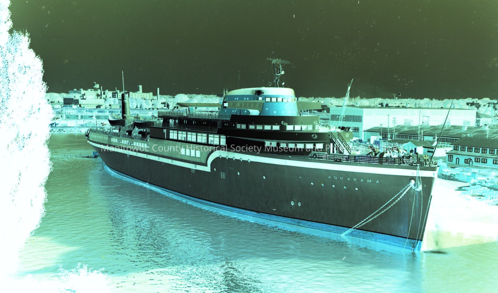 Aquarama, the last of the Great Lakes cruise boats, docked at Manitowoc Shipbuilding. Photograph taken circa 1962.