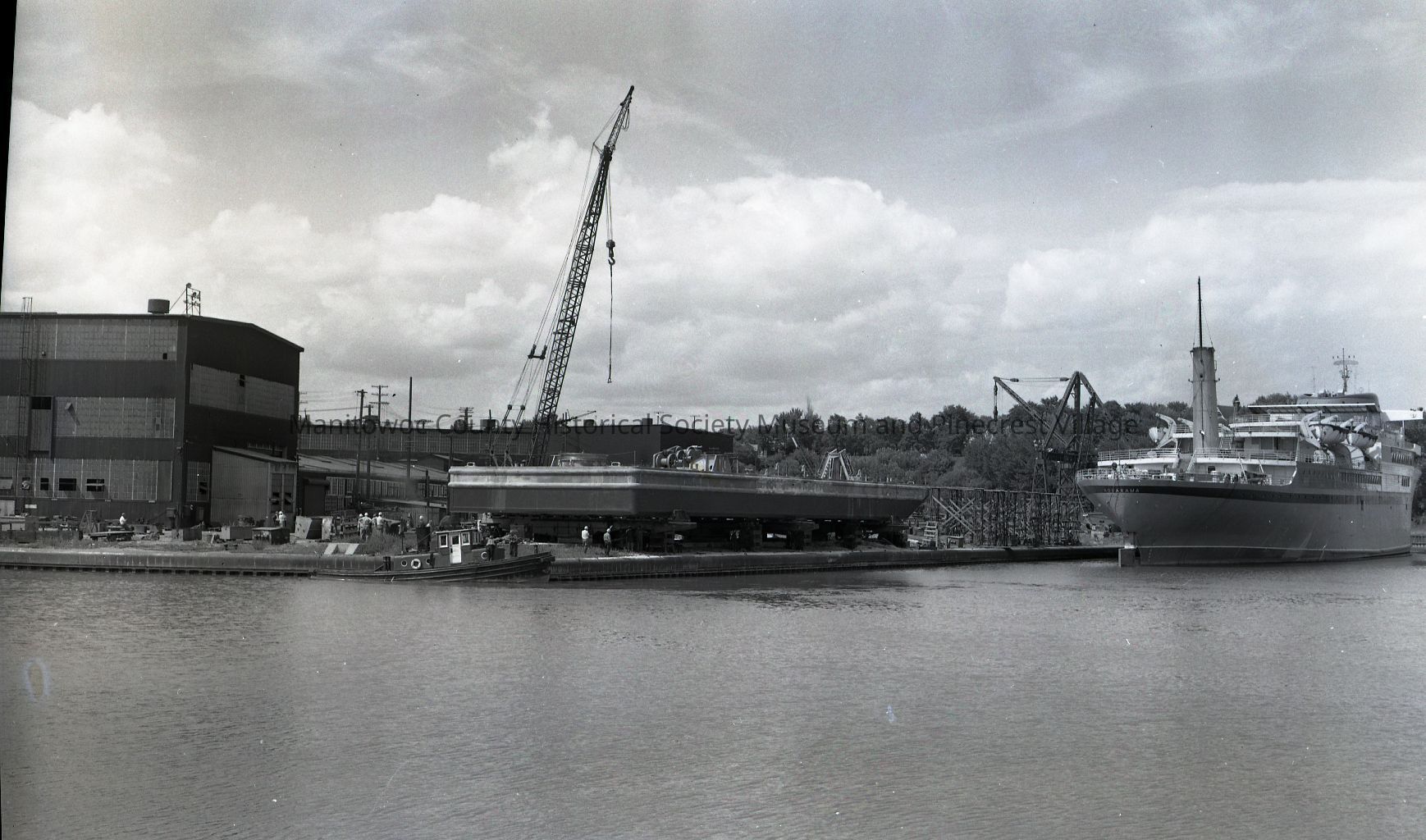 Looking at the stern of the Aquarama docked at Manitowoc Shipbuilding. A dredge is starting to be built on shore. Photograph taken circa 1962.Made/Created