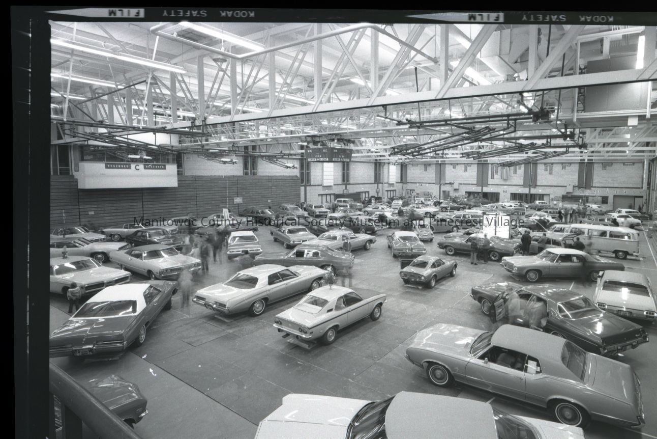 Auto Show at Lincoln High J.F.K. Center looking to the front from the east end balcony. Photograph taken February 3rd, 1972.Made/Created