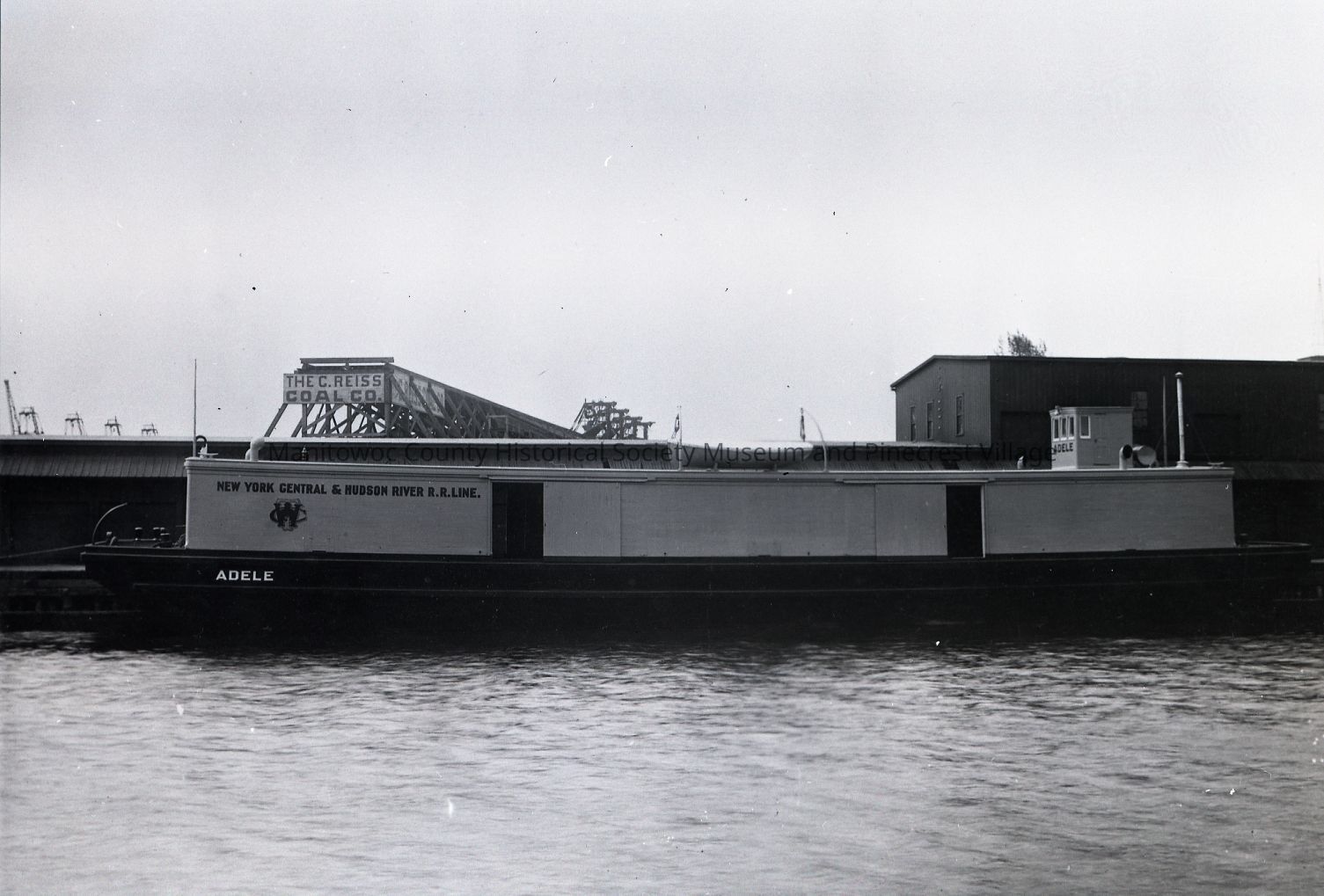Barge Adele of the New York Central & Hudson River RR Line docked by Pauly & Pauly Cheese and C. Reiss coal dock in Manitowoc. Circa 1900.Made/Created