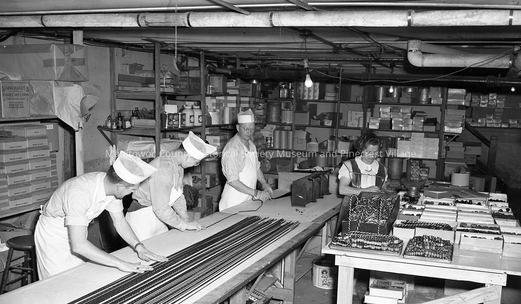 Beerntsen opera sticks; Richard, Glen, Joseph while Clara Jacobs packs chocolate HTR Dec 13, 1949 page 13 news & views