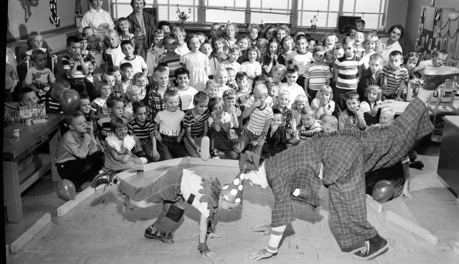 School - Ben Franklin, Manitowoc; clown from Billy Schultz Circus performs for class. Photograph taken on October 5th, 1955.Made/Created
