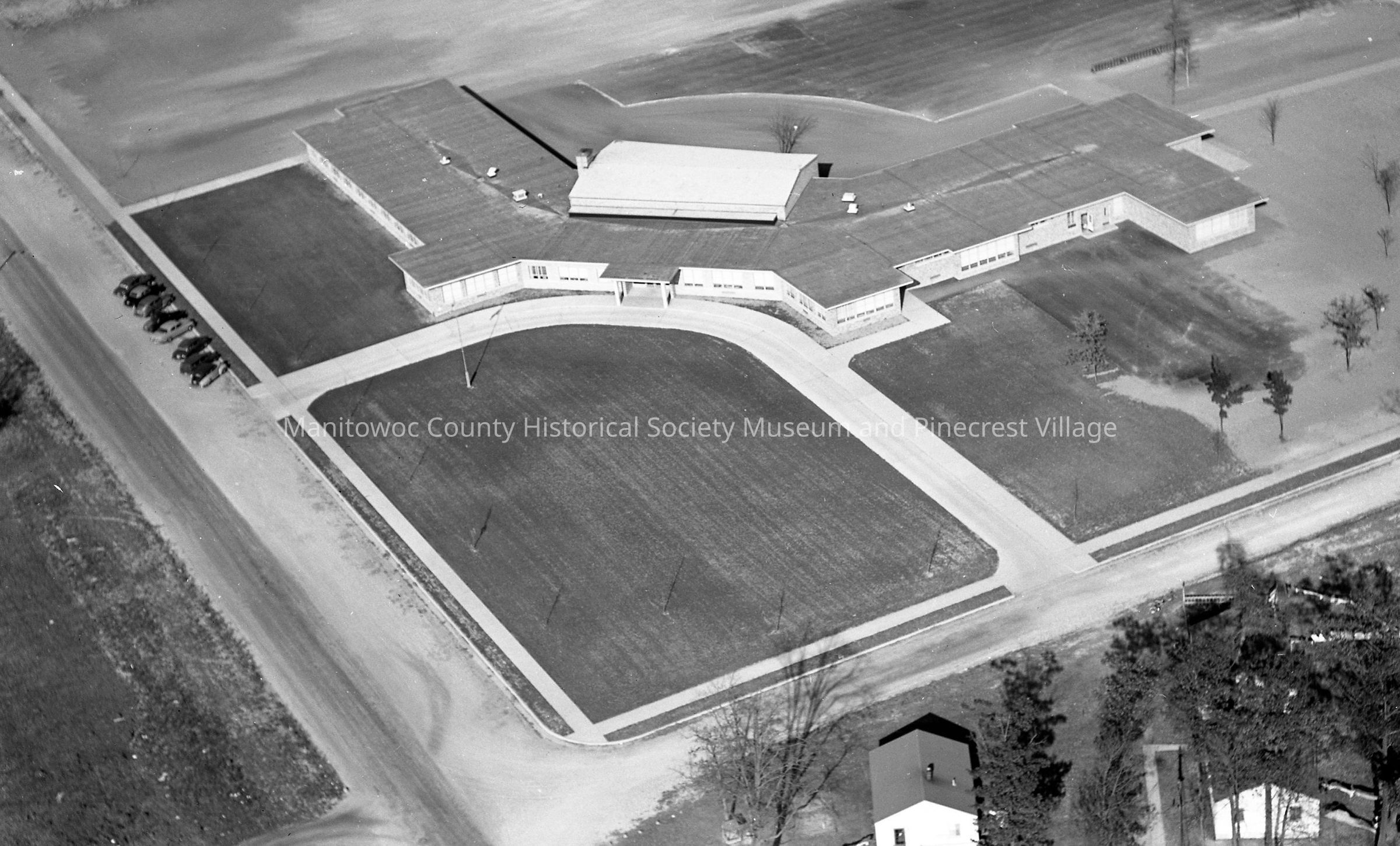Aerial view of Ben Franklin School, 800 South 35th Street Manitowoc looking at the intersection of South 35th & Dale Street. Photograph taken in 1954.Made/Created