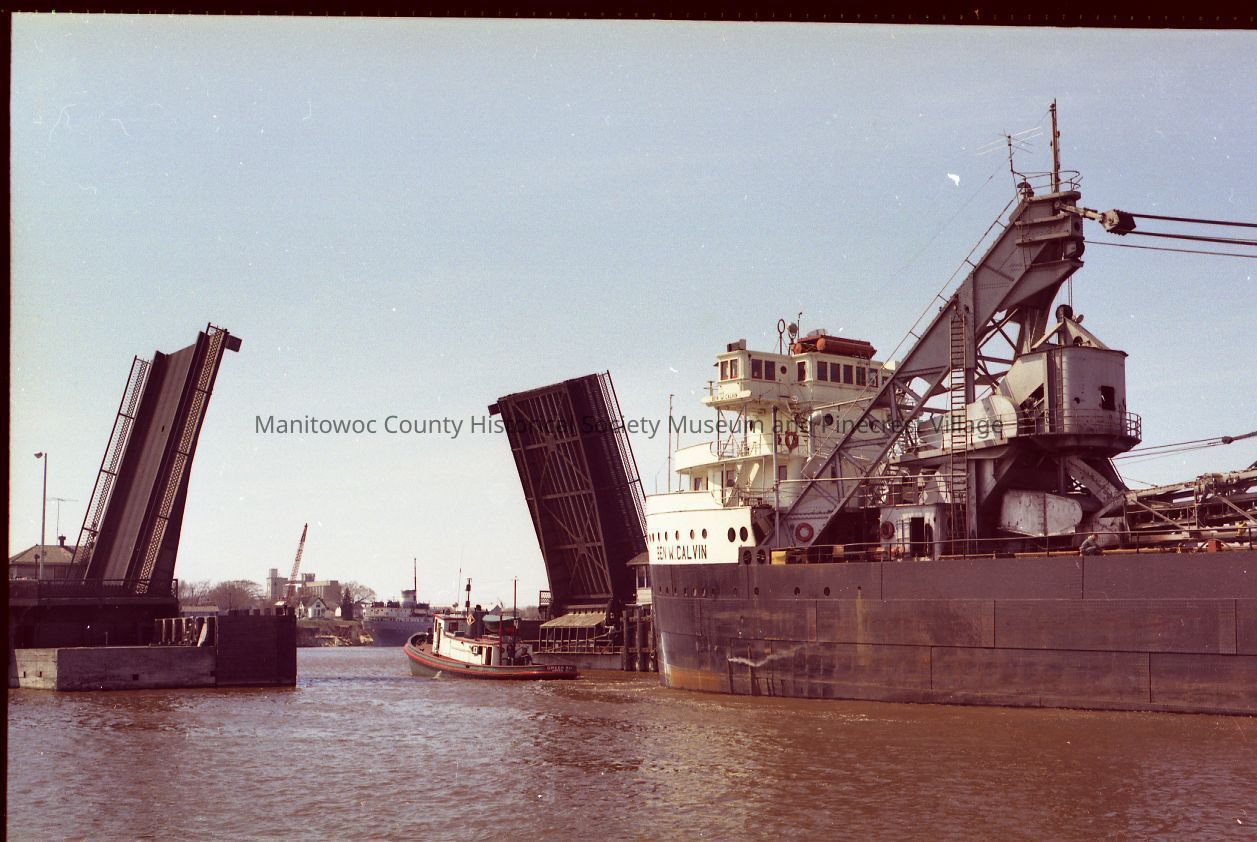 Ben W. Calvin being towed up river by the tug Green Bay through the 10th Street bridge. Photograph taken on May 5th, 1967.Made/Created