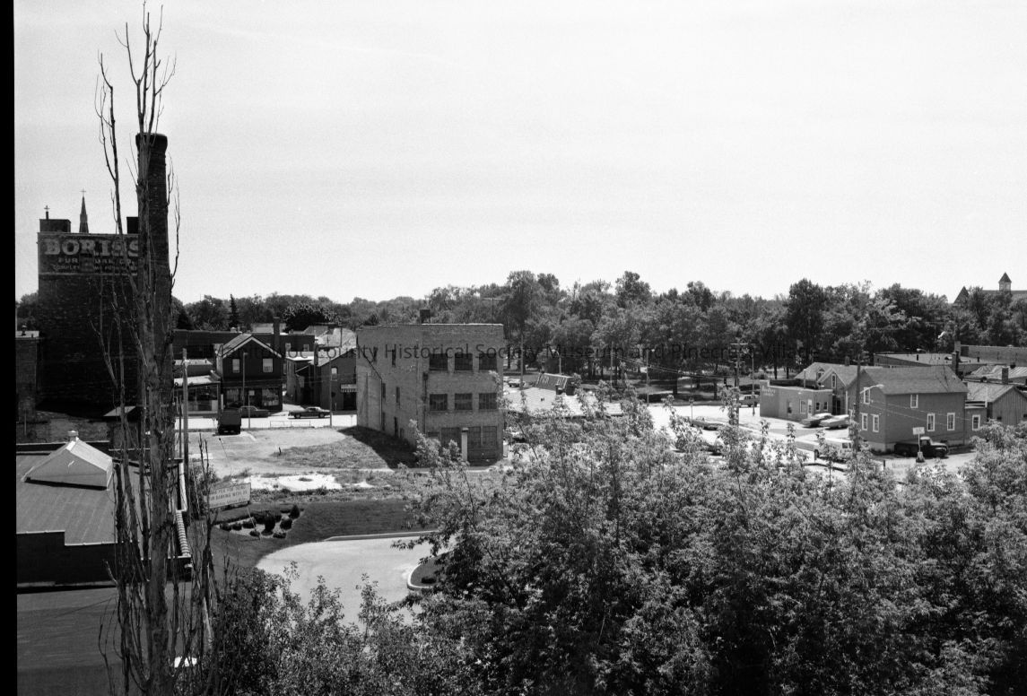 Birds-eye from 1011 Franklin Street Manitowoc looking south at South 11th & Washington. At right is home at 930 South 11th and next is Parkview Barber Shop, 1104 Washington; across street is Washington Park. Above trees center is Pizza Hut, 1022 Washington, next is 1018 Washington Pizza Garden, 1015 and 1013 Washington Street. Above trees upper right corner is old Adams School on South 12th Street. Photograph taken on August 16th, 1976.Made/Created