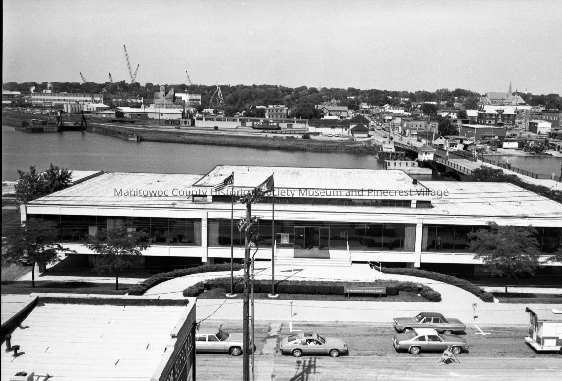 Birds-eye from 1011 Franklin Street Manitowoc looking north. At bottom is Manitowoc Savings Bank, 1000 Franklin and behind is Manitowoc River and Soo Line RR carferry slip. At right is 10th Street bridge and North 10th Street. Going up North 10th at left is old Soo Line RR depot, 102; right side is Bud's Bar, 924 Commercial Street; D&J Restaurant, 105 North 10th and Wickman's Cycle Shop, 109 North 10th. At upper left is Manitowoc Shipyards Complex. Photograph taken on August 16th, 1976.Made/Created