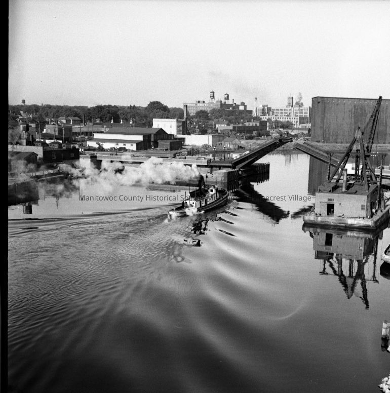 Birds-eye from Guse Lumber Company, 901 Commercial Street Manitowoc looking west towards South 10th Street. Tug Green Bay about to go through 10th Street bridge. Beyond is Elevator B. At right is McMullen & Pitz, 923 Commercial; center behind bridge is old Mantowoc Lumber, 1022 Franklin and ther old Riverview Brewery building, 110 South Water Street. Photograph taken on October 3rd, 1952.Made/Created