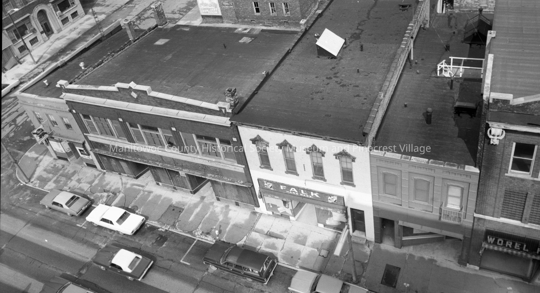 Birds-eye from Hotel Manitowoc of 200 block North 8th Street Manitowoc. At right is Worel Hardware, 205; Ray's Barbershop, 207; Falk Hardware, 209; Shimek Furniture, 211; and Hammy's Bar, 215 North 8th Street. Photograph taken in July 1960.Made/Created