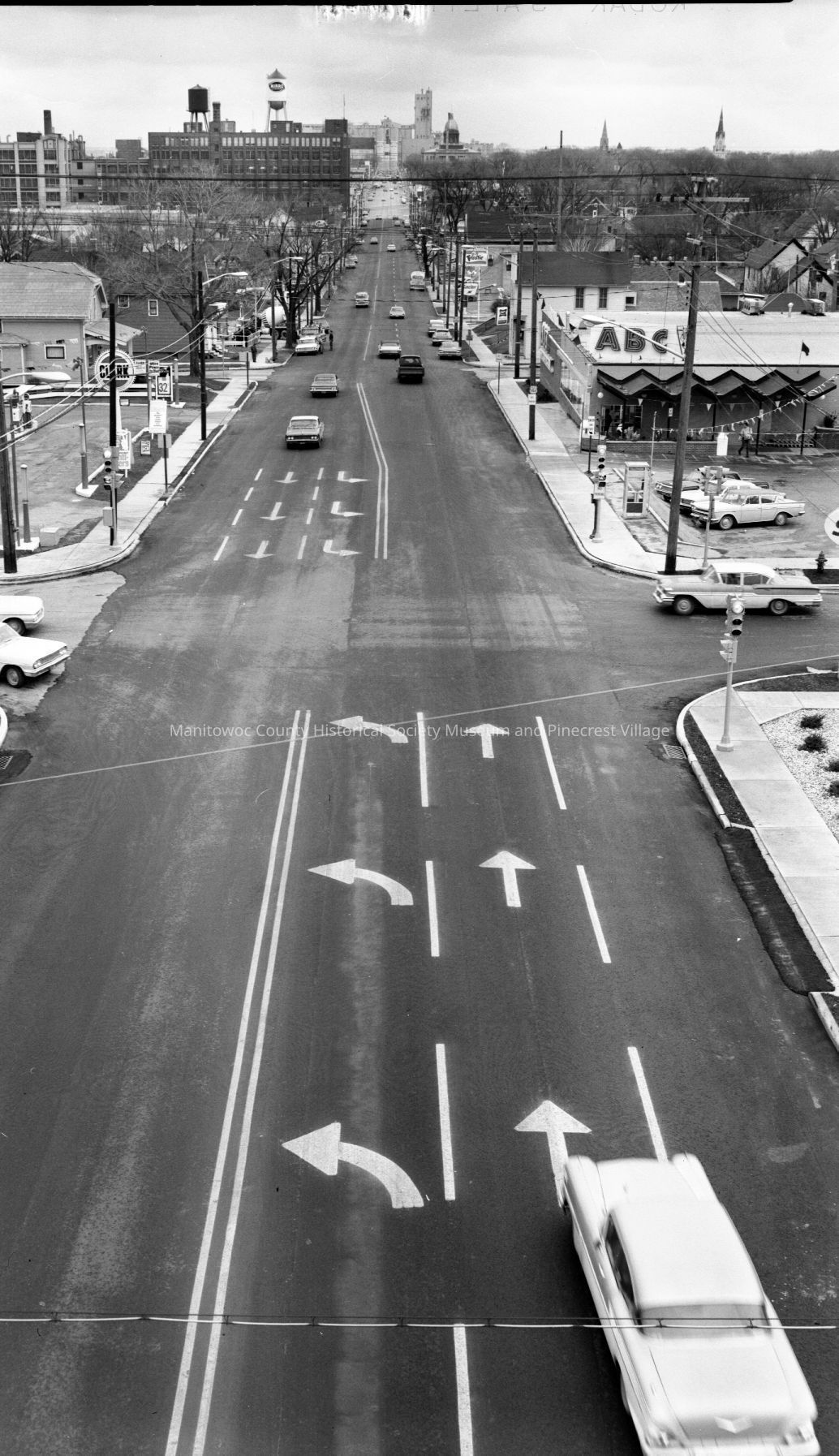Birds-eye of Washington Street Manitowoc from South 21st Street. At left is Marty's Clark Station, 2002 Washington. At right is ABC Super market, 2001; Blackies'Bar, 1915-1911-1905; Miller's Sinclair Station, 1901; Ruppel's Target Station and Dunning's Grocery, 1805 Washington Street. In the distance is Mirro Aluminum, Manitowoc County Courthouse and Rahr Malting, Photograph taken in December 1967.Made/Created