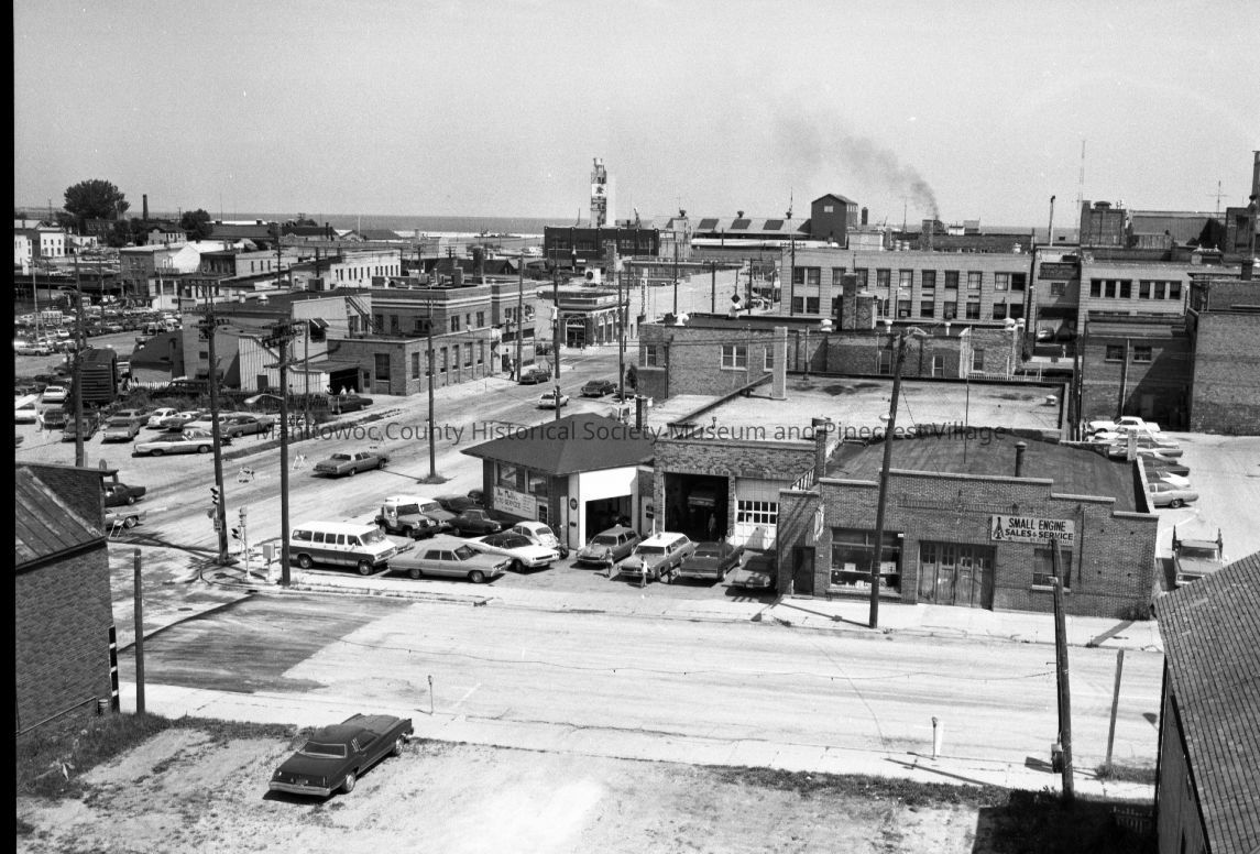 Birds-eye from top of Ridge Motor Supply, 1011 Franklin Street Manitowoc. Looking east at center is Don Moddie Auto repair, 901 South 10th and Small Engine Service, 905 South 10th. On Franklin at left is the Herald Times newspaper, 902 Franklin and Ken Lewis car dealership, 822 Franklin Street. Photograph taken on August 16th, 1976.Made/Created