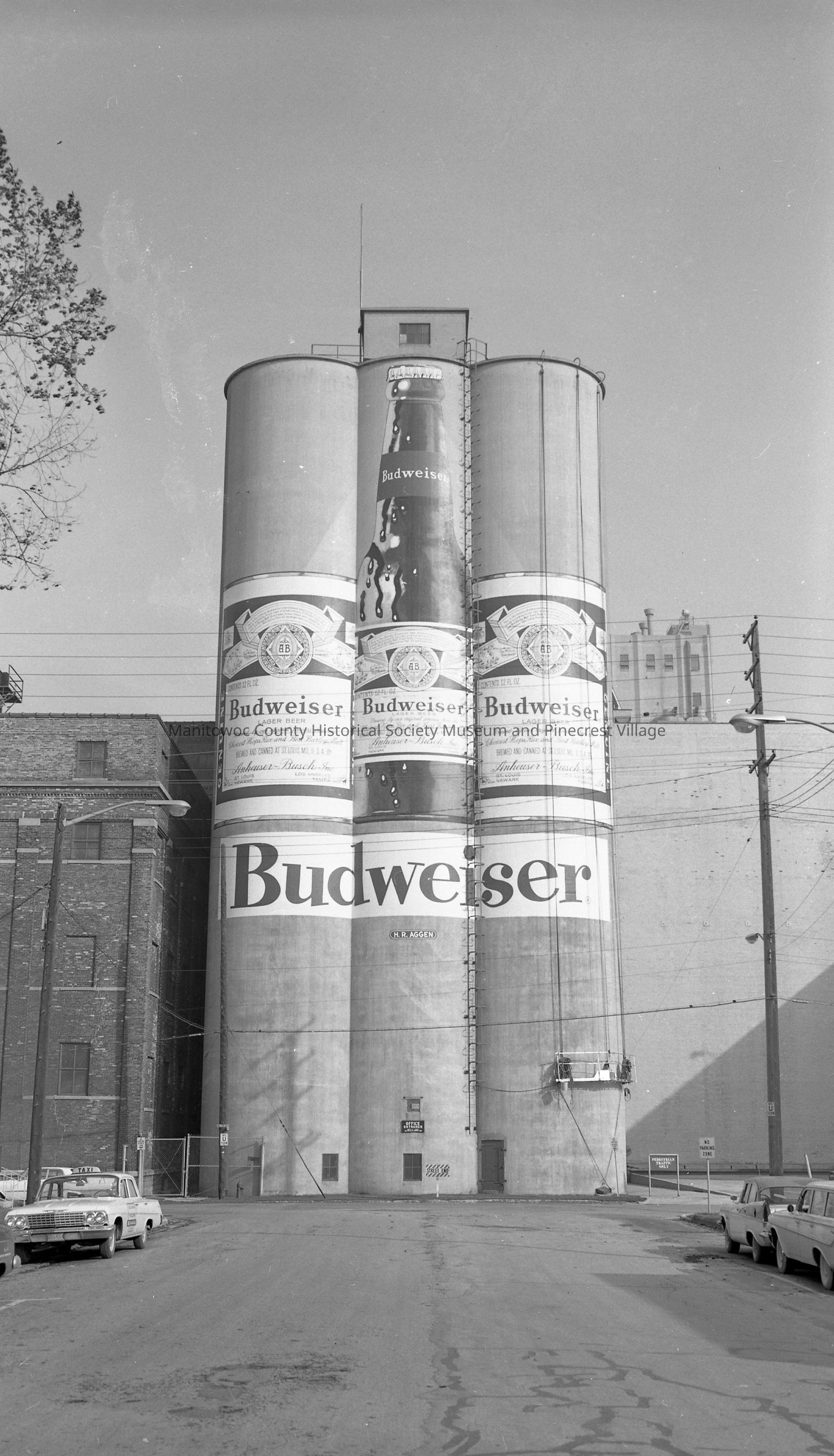 Budweiser sign on Rahr silos east end of Washington Street, Manitowoc. At left is Checker Taxi Service, 704 Washington Street