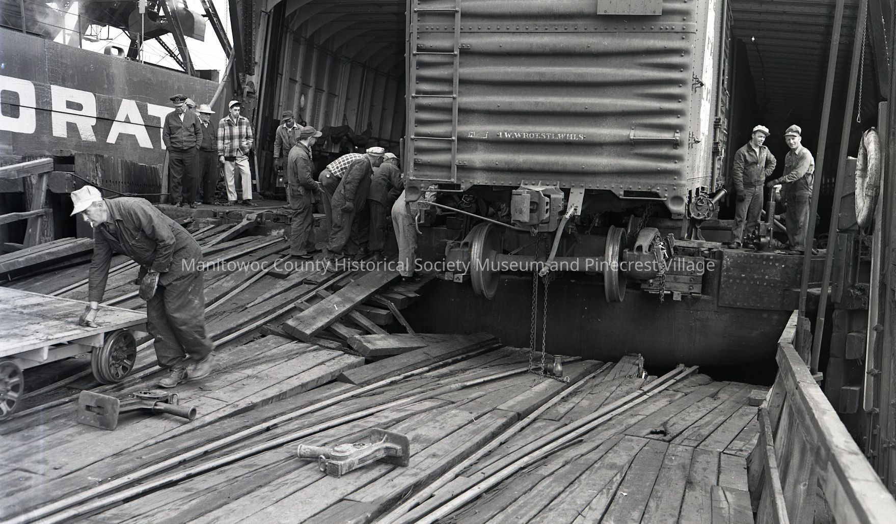 C&O RR carferry slip apron damaged with car half off. Notice at upper left coal boat being unloaded with clam shell bucket at C. Reiss coal dock. Photograph taken on May 8th, 1952.Made/Created