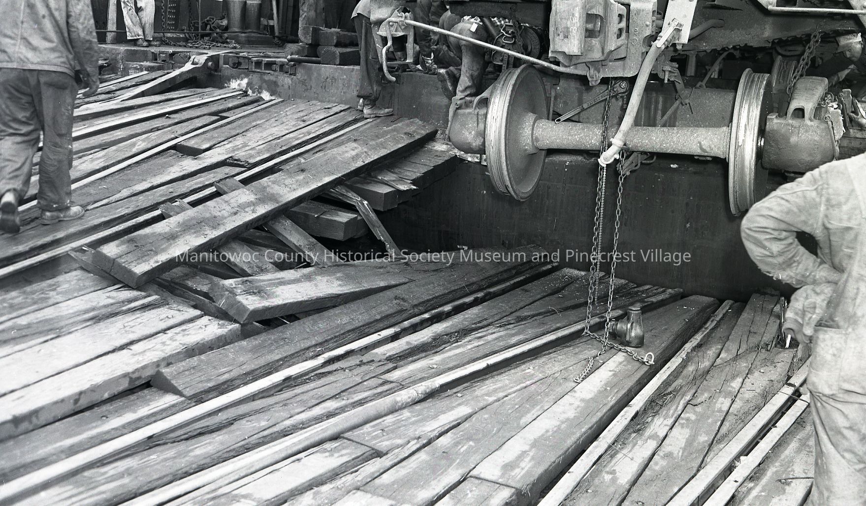 C&O RR carferry slip apron damaged with car half off carferry. Photograph taken on May 8th, 1952.