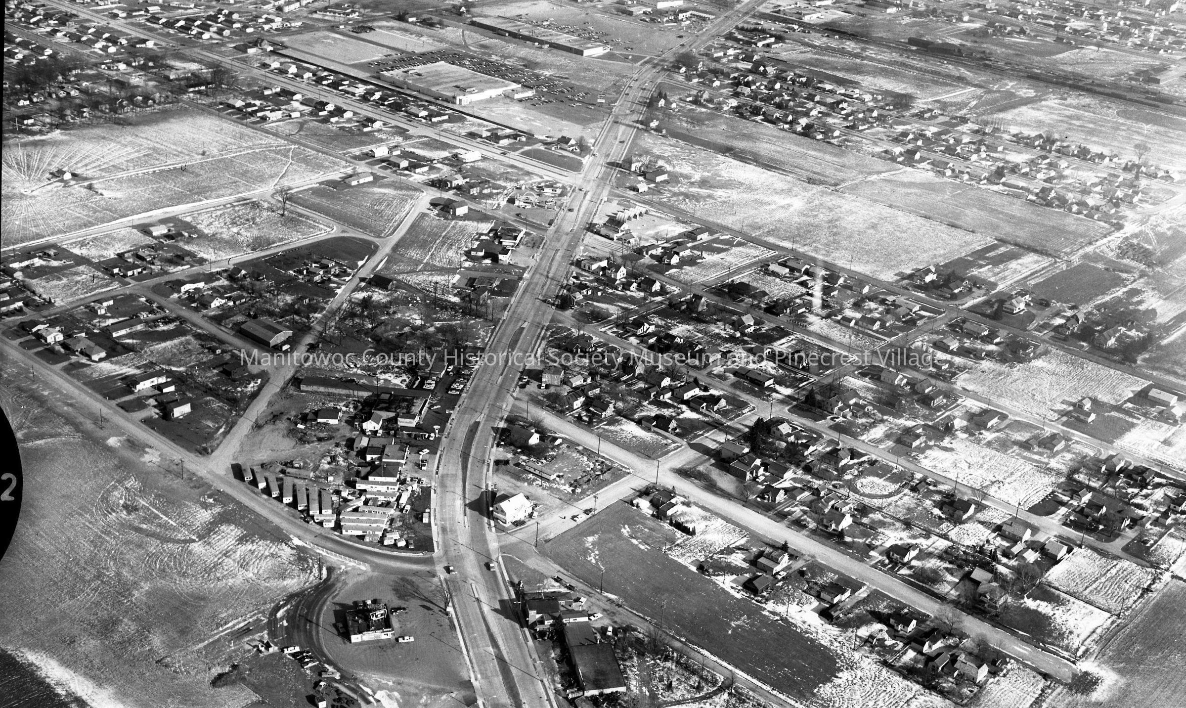 Aerial looking northeast up Calumet Ave. from South 39th Street Manitowoc. Building just up from plane wing is the Penquin Drive-In, 3900 Calumet Ave. Photograph taken on December 3rd, 1966.Made/Created