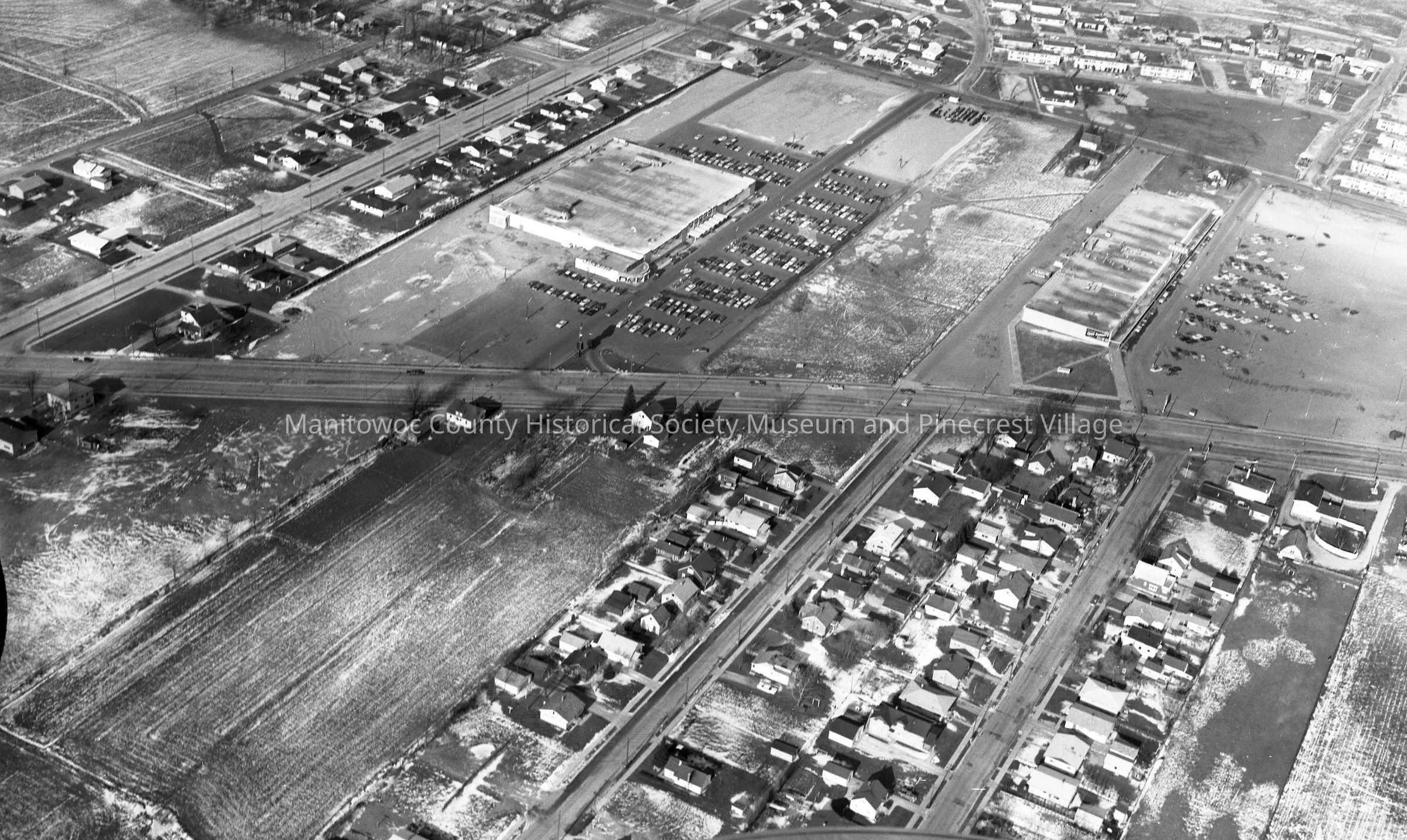 Aerial of Calumet Ave. Manitowoc. At right is Park Plaza Shopping Center, 1100 South 30th Street and behind is Copps Store, 3300 Calumet Ave. Street behind Copps is South 35th Street. Photograph taken on December 3rd, 1966.Made/Created