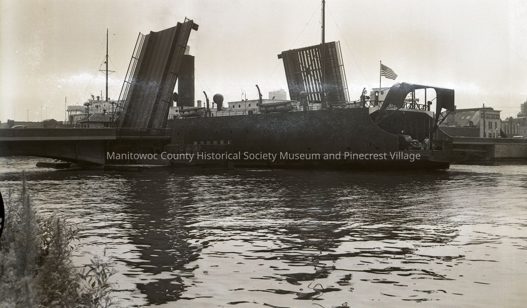 Car ferry Ann Arbor #5 going through 10th Street bridge on its way out. At right is the Spindler Co. office and Manitowoc County Courthouse with work being done to its dome. Photograph taken on August 14th, 1951.Made/Created