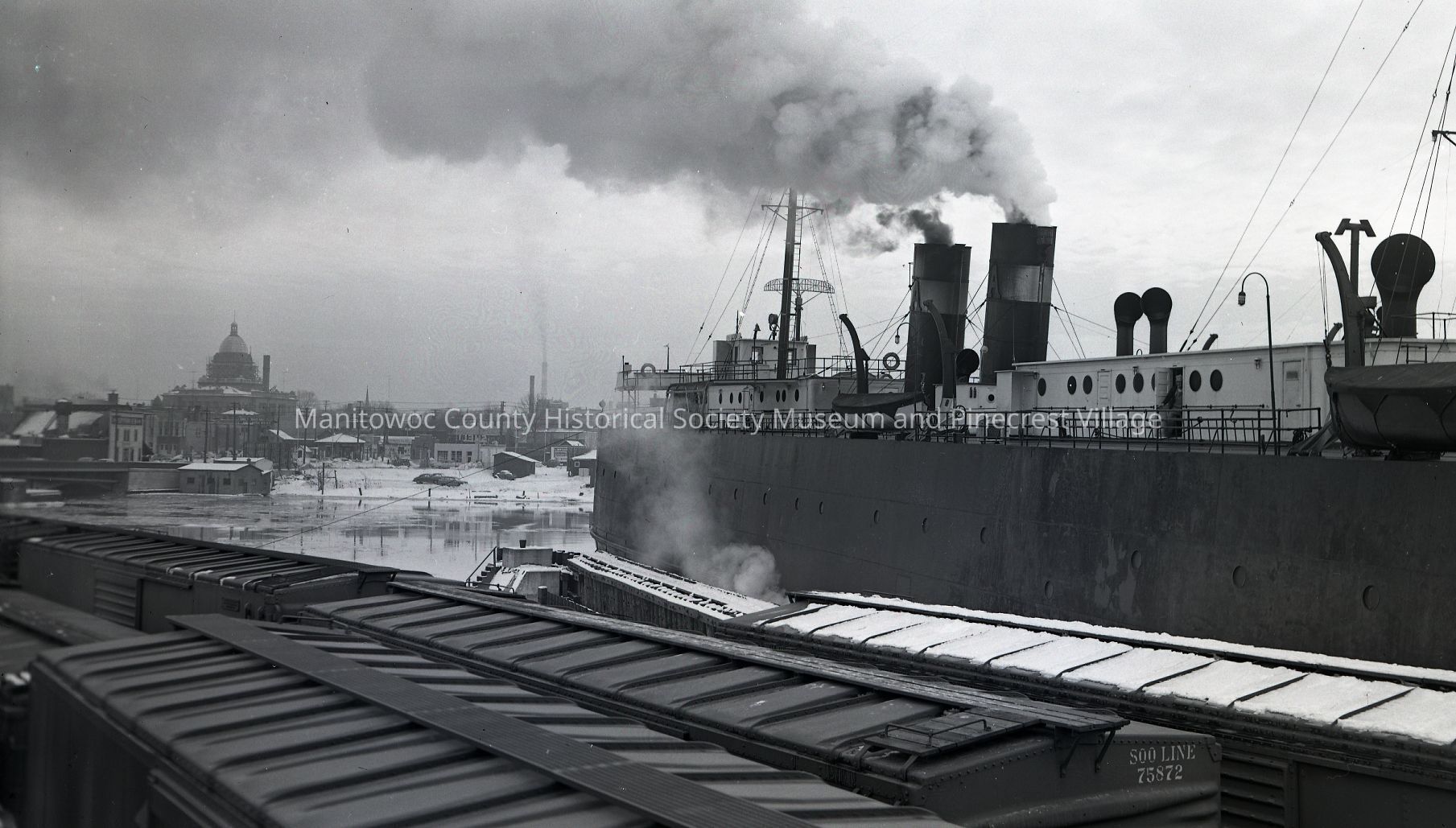 Car ferry Ann Arbor #5 at Soo Line slip Manitowoc lakefront. In background is intersection of South 10th Street & Franklin Street with MIller's Dixie Service Station, 901 South 10th Street in the center. Photograph taken on January 12th, 1952.Made/Created
