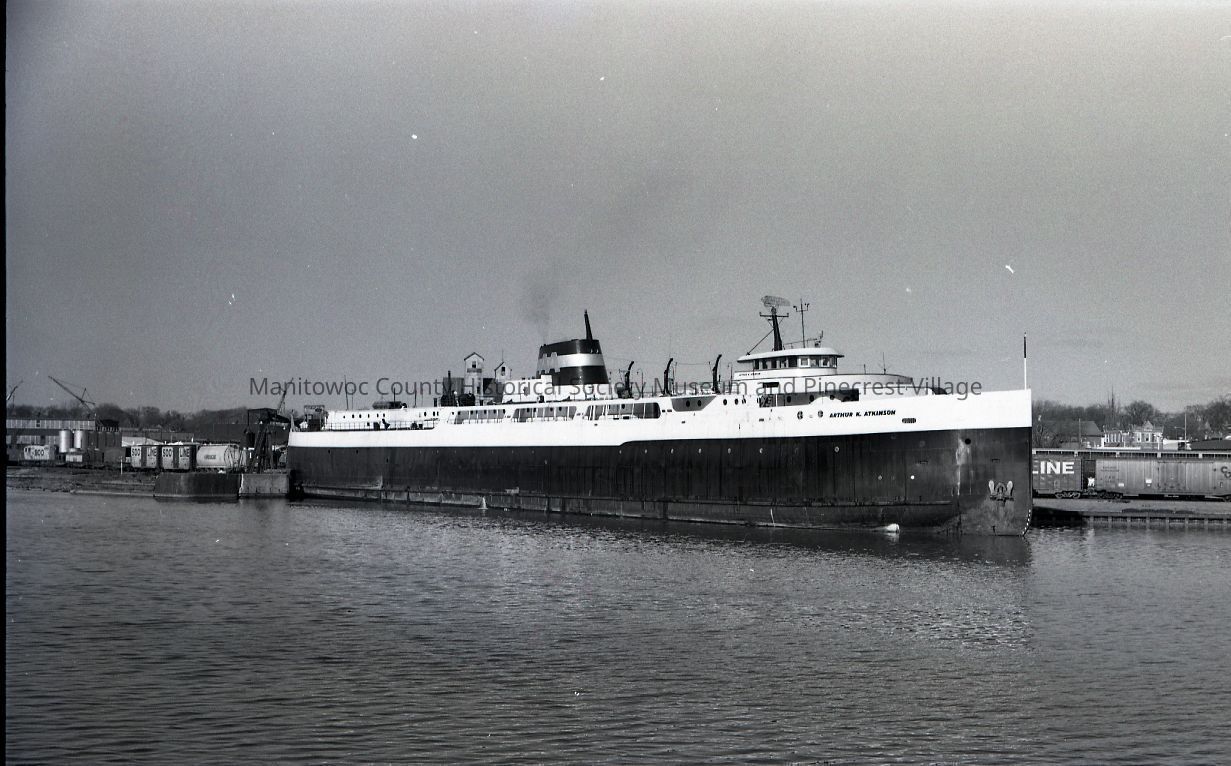 Carferry Arthur K. Atkinson docked at the Soo Line slip Manitowoc. Notice she has no life boats on her. Photograph taken on December 4th, 1969.Made/Created