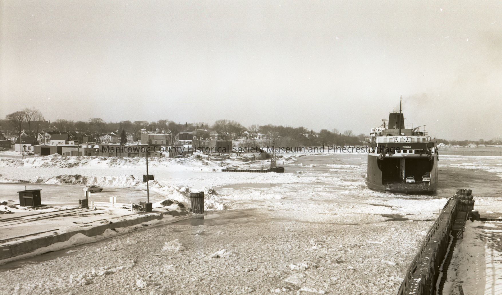 Carferry Badger turning and backing in ice at lakefront slip Manitowoc. Photograph taken on February 8th, 1974.