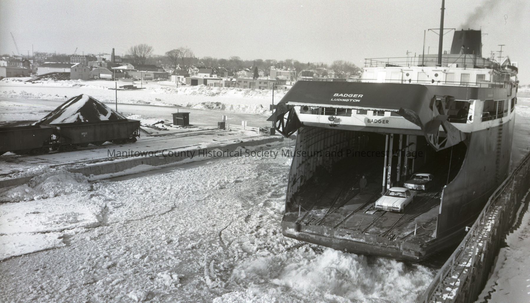 Carferry Badger at lakefront dock Manitowoc. Seems to be backing into the C. Reiss coal slip with only two autos on board. Photograph taken on February 8th, 1974.Made/Created