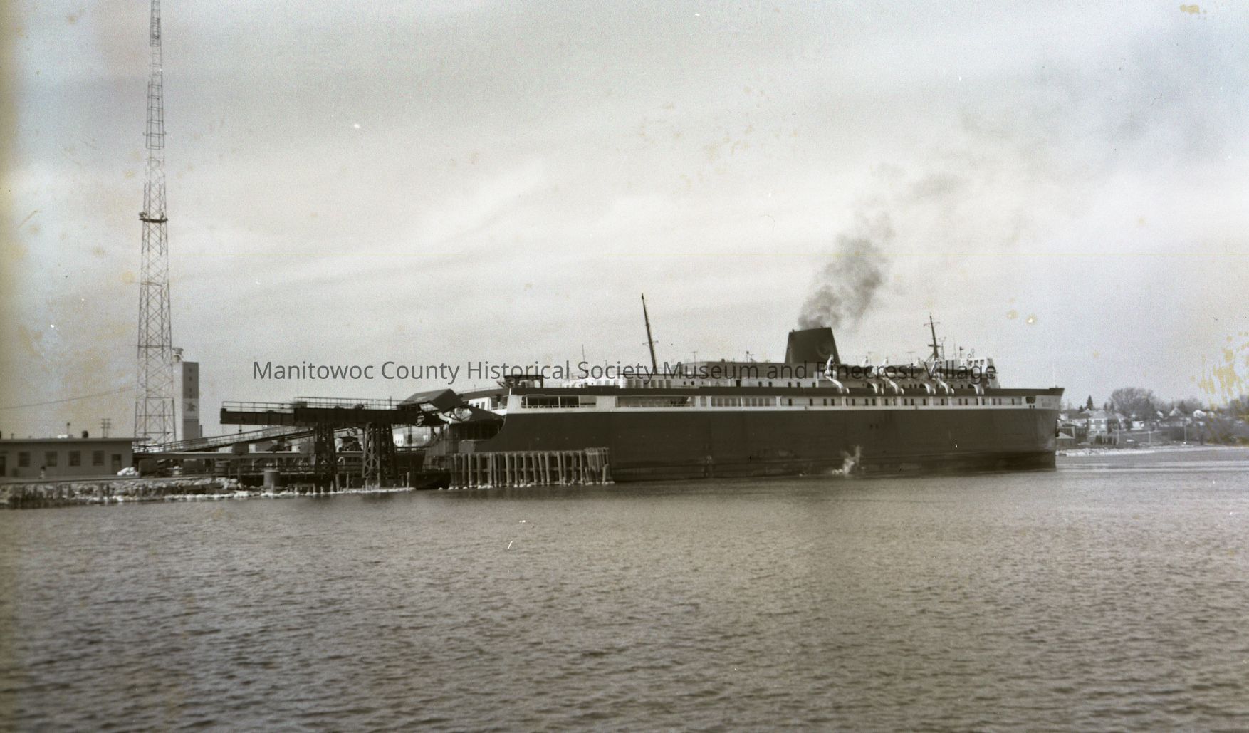 Carferry Badger at lakefront slip Manitowoc. Photograph taken on December 16th, 1981.