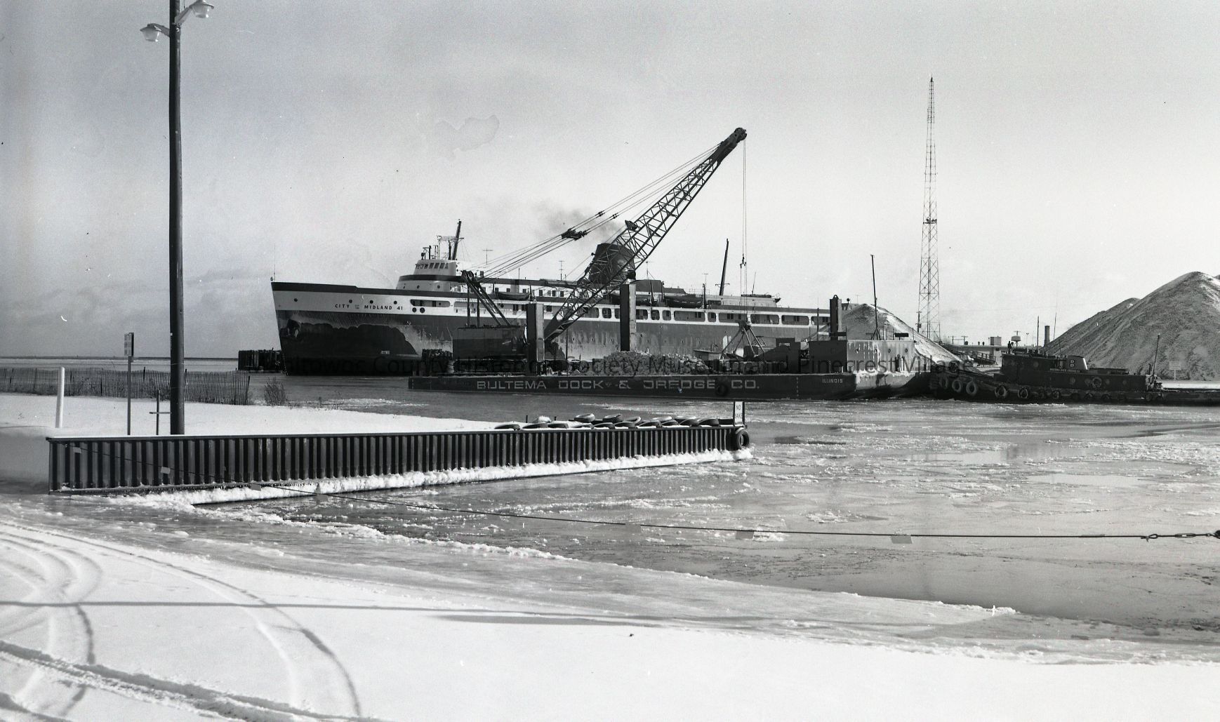Carferry City of Midland at lakefront slip Manitowoc. At right is C. Reiss coal dock and at center is Manitowoc Municipal boat launch at east end of Commercial Street. Photograph taken on December 6th, 1972.Made/Created
