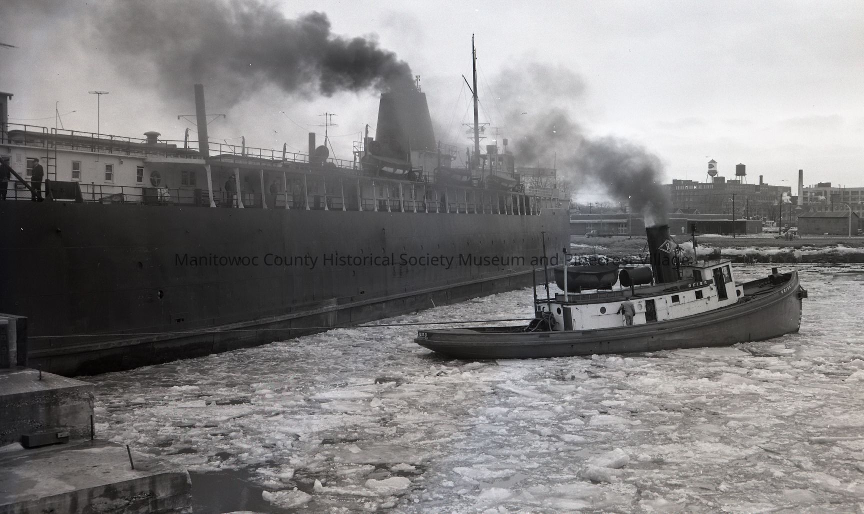 Carferry City of Saginaw getting help from tug Reiss to turn in ice at Soo Line slip in Manitowoc. Photograph taken on February 10th, 1966.Made/Created