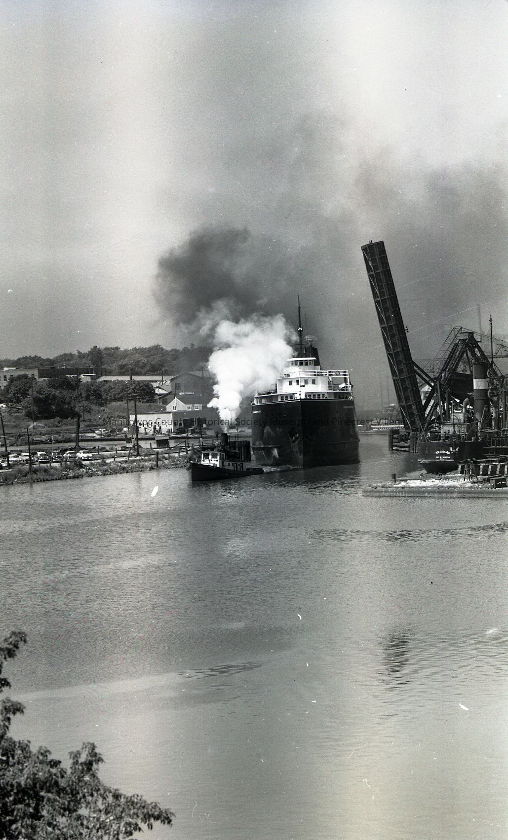 Carferry Pere Marquette #22 being towed through the jacknife bridge by tug Green Bay. At right is the sandsucker American. Photograph taken in 1957.Made/Created