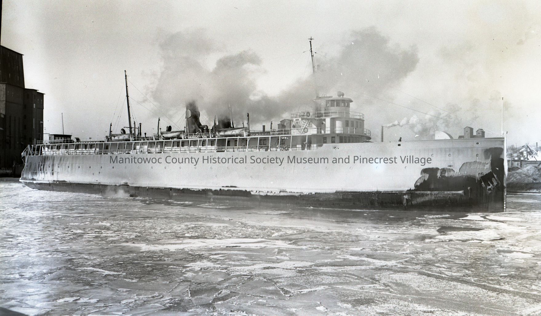 Carferry Pere Marquette #22 turning to dock at Soo Line slip after winter crossing. Photograph taken on January 14th, 1948.Made/Created