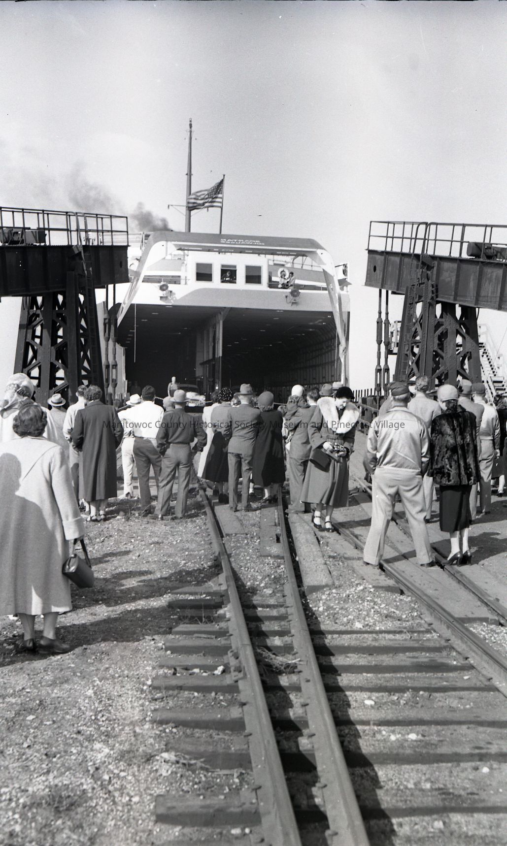 Car ferry Spartan backed into lakefront slip Manitowoc with passengers waiting. Photograph taken on October 26th, 1952.Made/Created