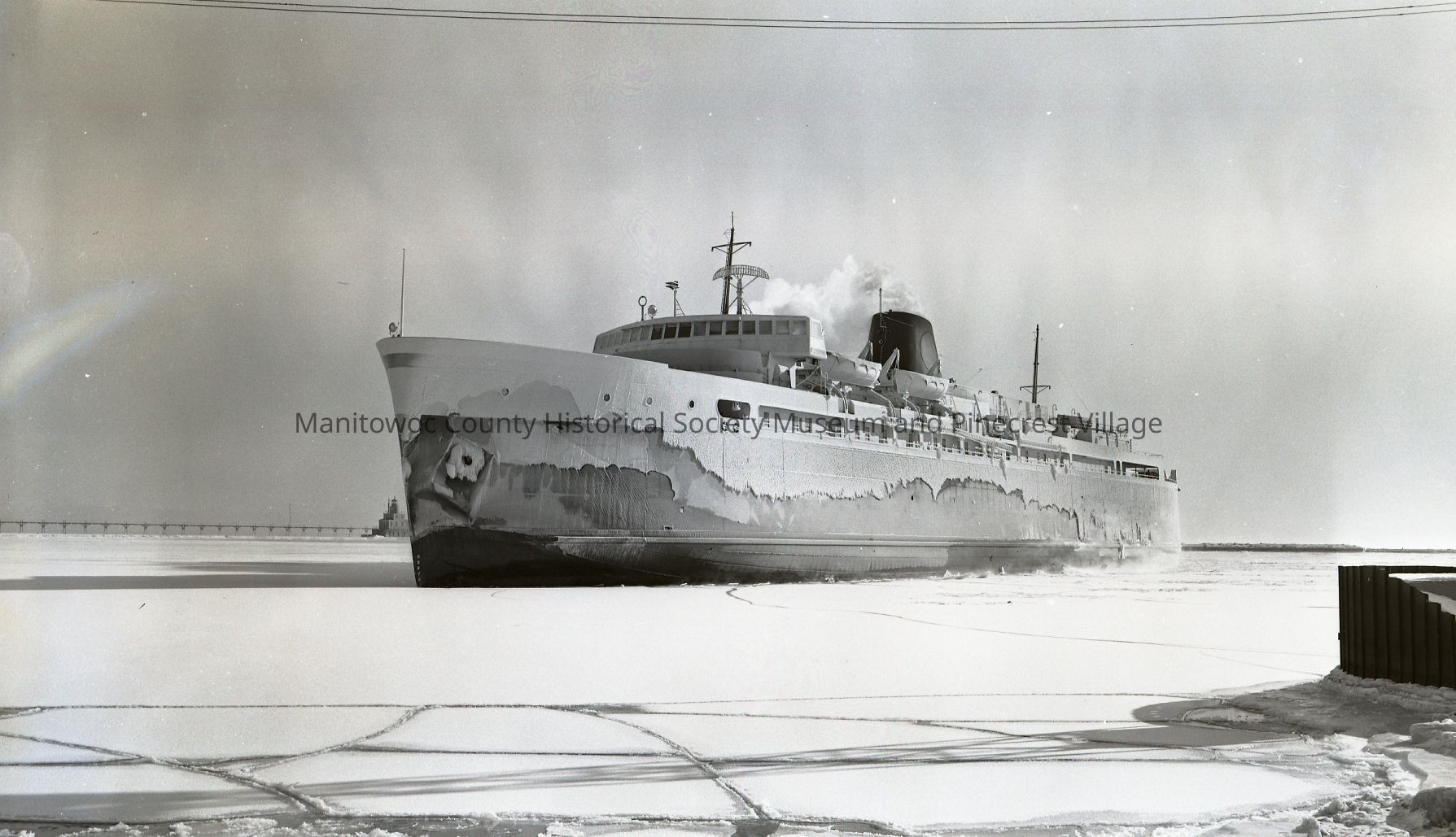 Carferry Spartan coming into Manitowoc after a winter crossing with a coat of ice. Photograph taken on January 27th, 1955.Made/Created