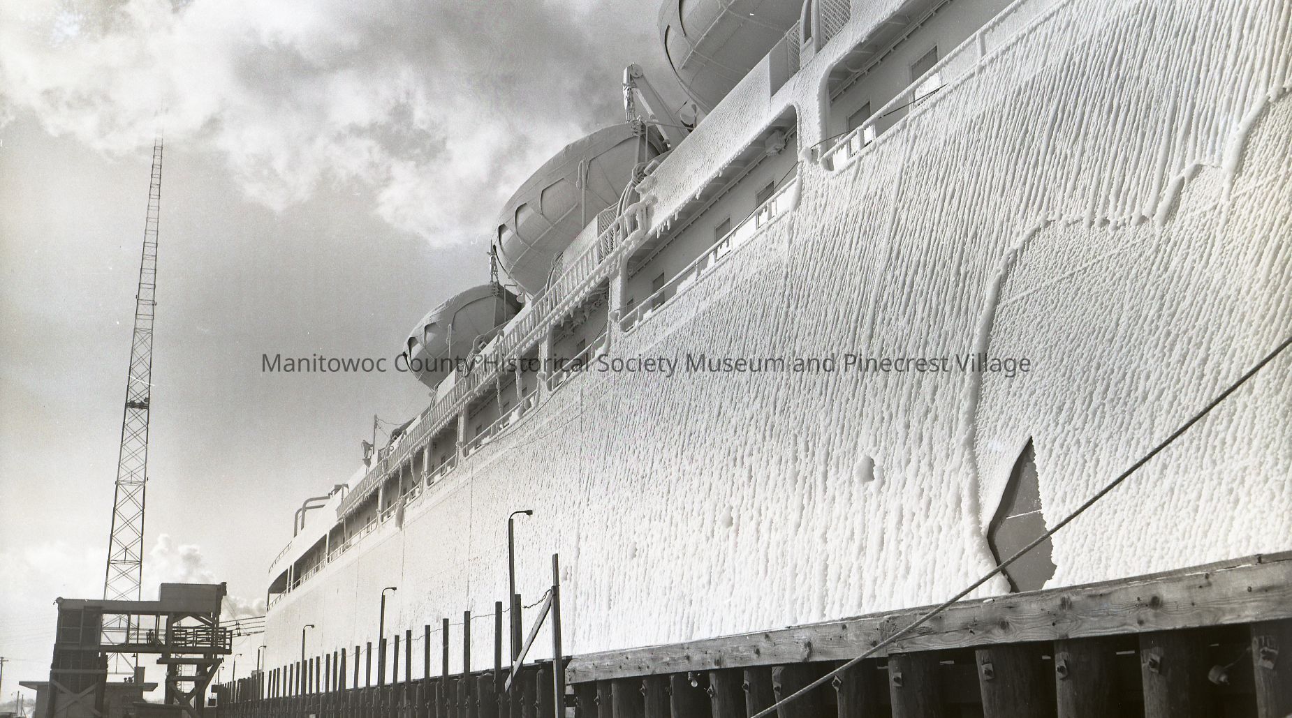 Ice on hull of carferry Spartan after winter crossing. Photograph taken on January 27th, 1955.
