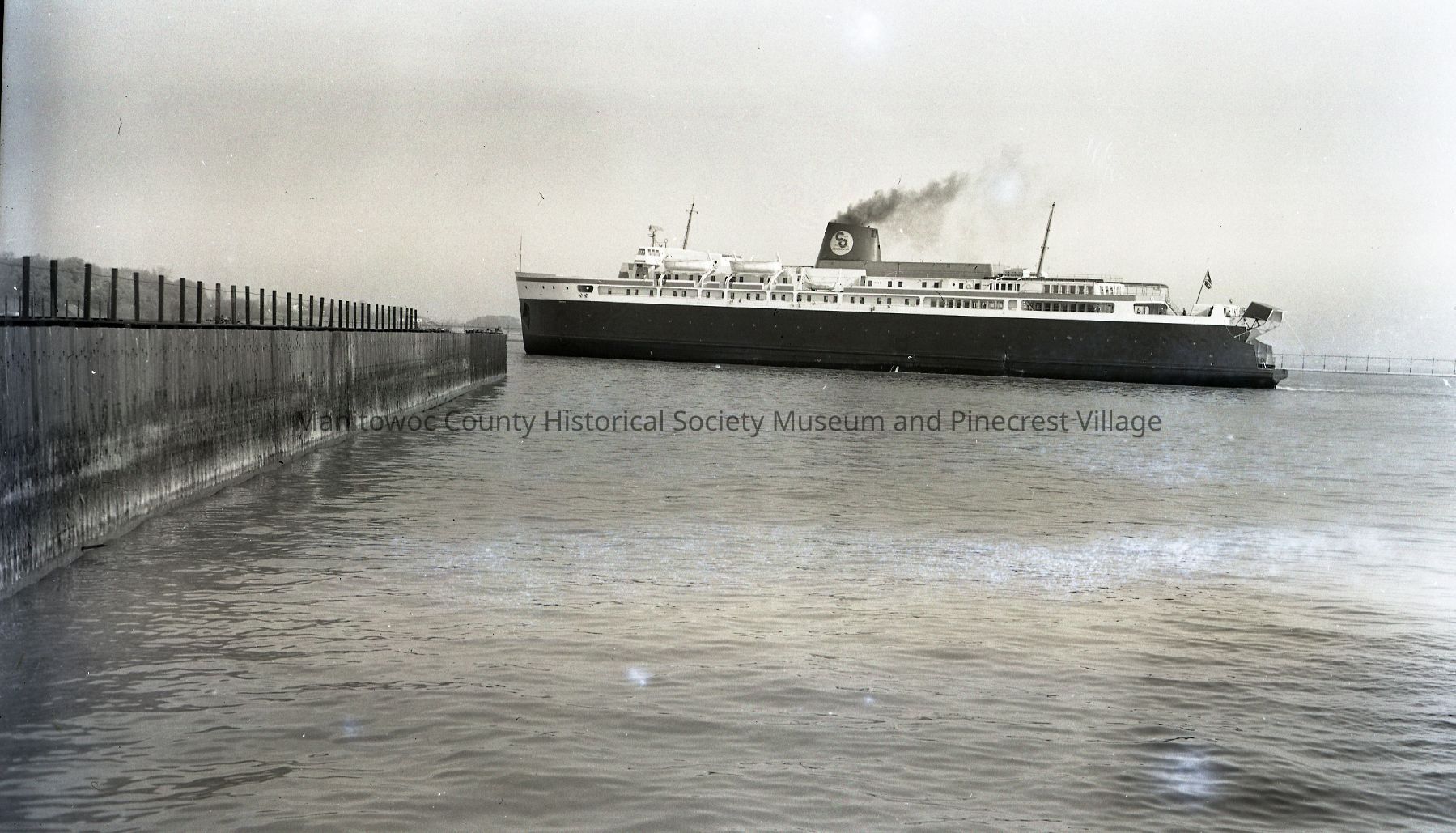 Car ferry Spartan turming to back into lakefront slip Manitowoc. Photograph taken on October 26th, 1952.