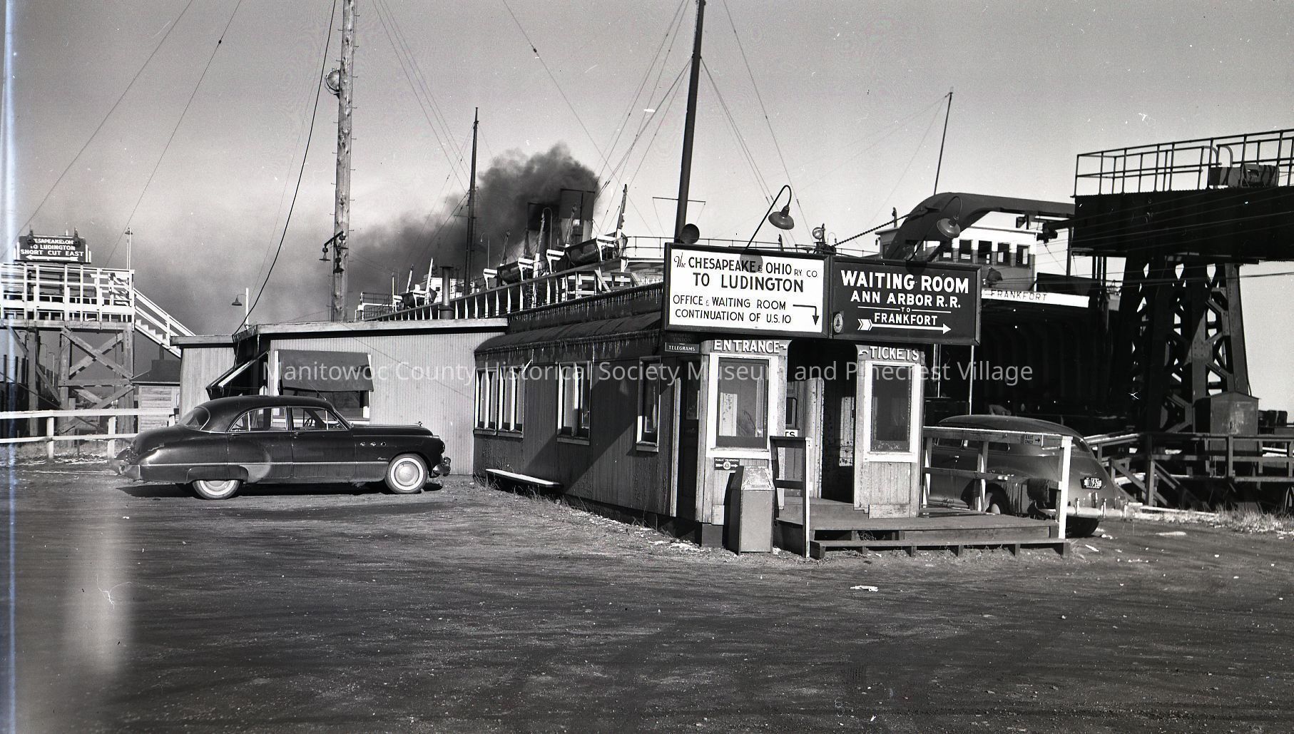 Old ticket office and waiting room for carferry. Notice separate entrances. Photograph taken on January 10th, 1951.Made/Created