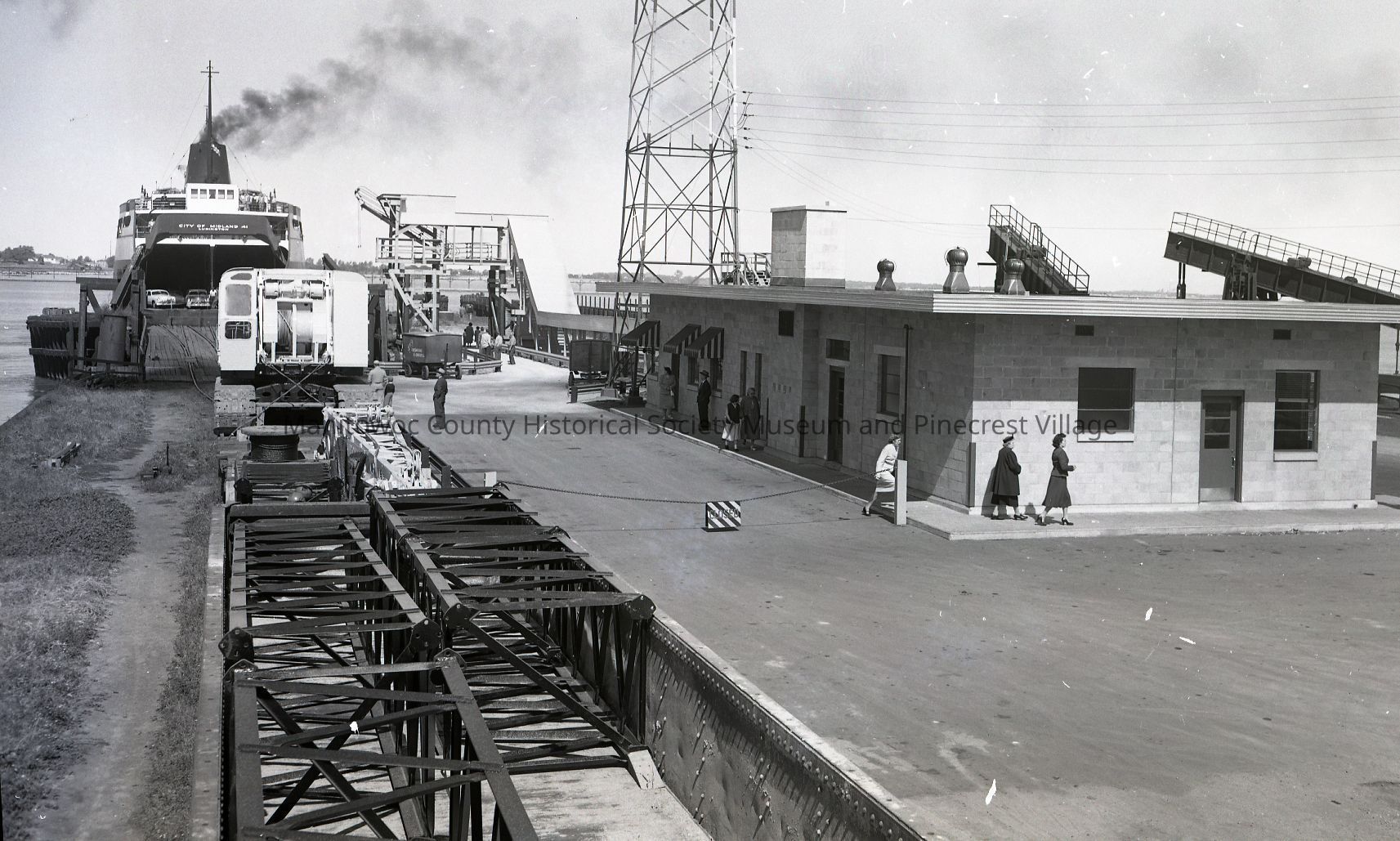 Carferry ticket office. At left is City of Midland and a Manitowoc crane being loaded on her starboard side. Photograph taken in 1955.Made/Created
