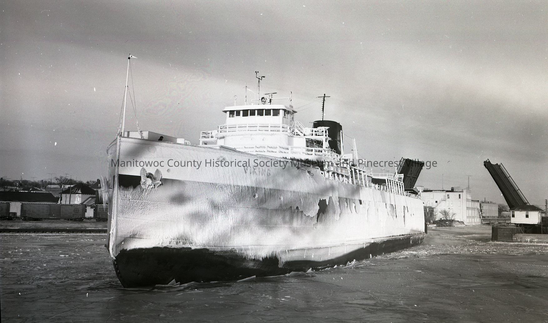Car ferry Viking coming through the 10th Street bridge after a winter lake crossing. Photograph taken on January 26th, 1972.Made/Created
