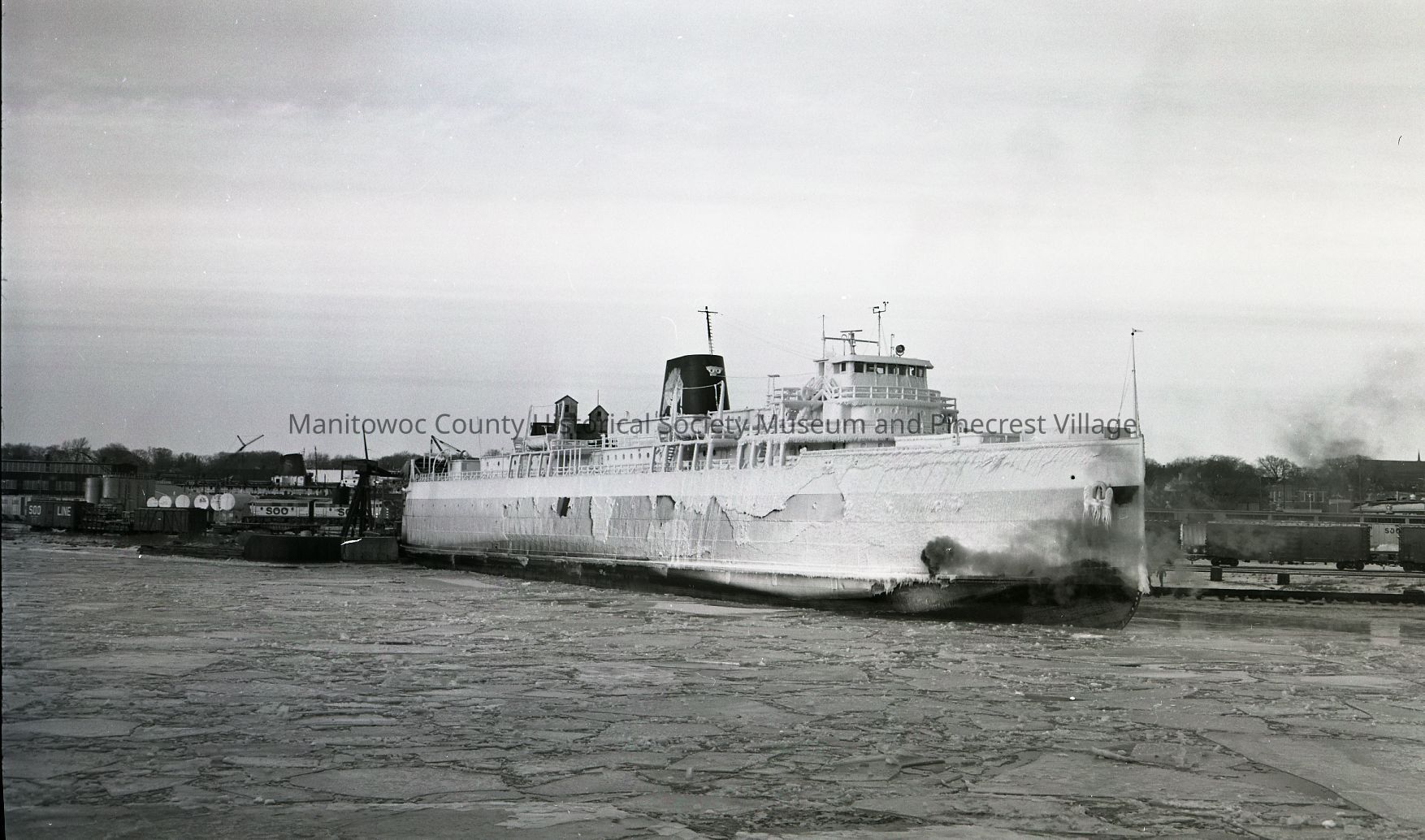 Carferry Viking at Soo Line slip in Manitowoc after an icy winter lake crossing. Photograph taken on January 26th, 1972.Made/Created