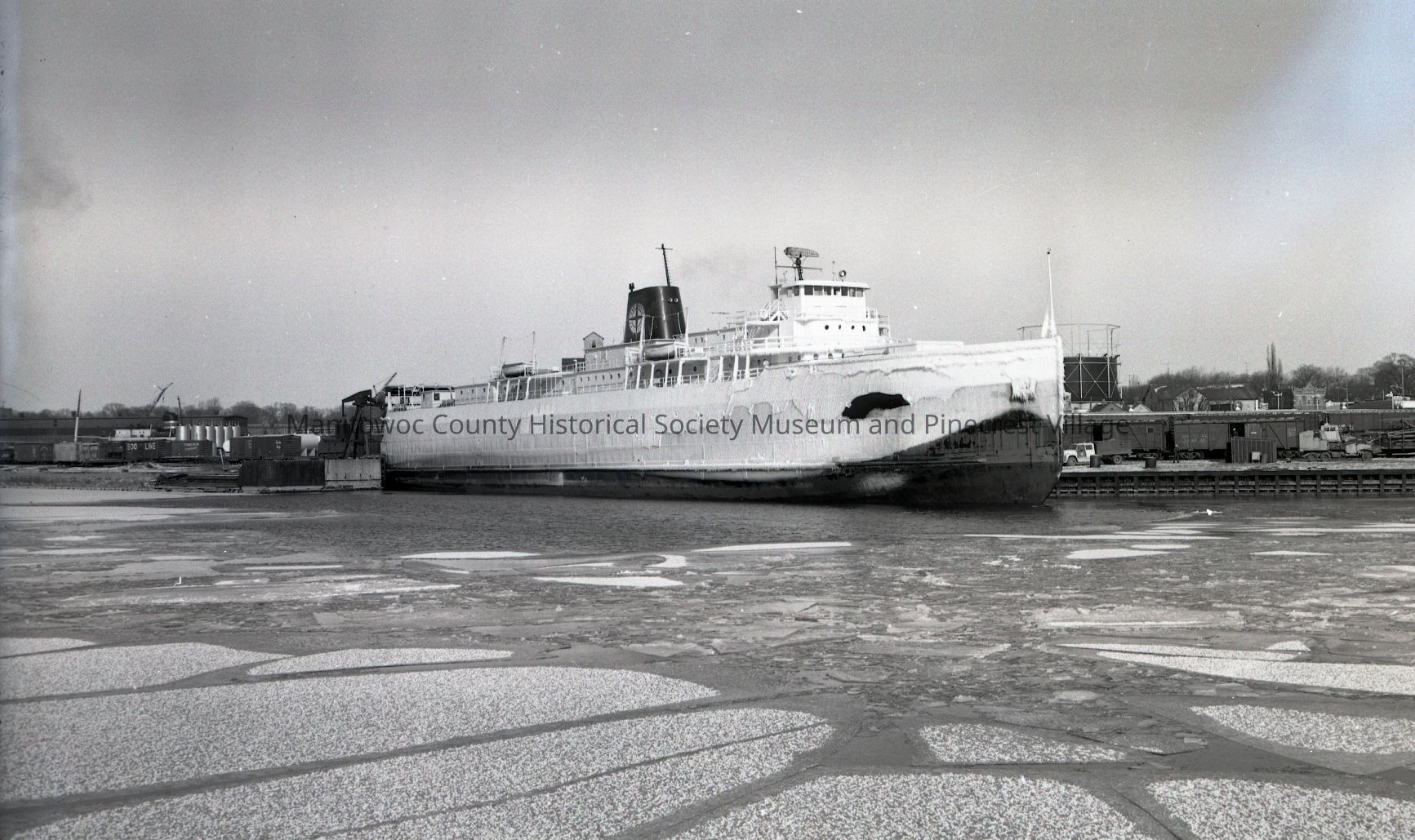 Carferry Viking docked at the Soo Line slip in Manitowoc after a winter crossing. At right are the Soo Line railyards. Photograph taken on January 11th, 1966.Made/Created